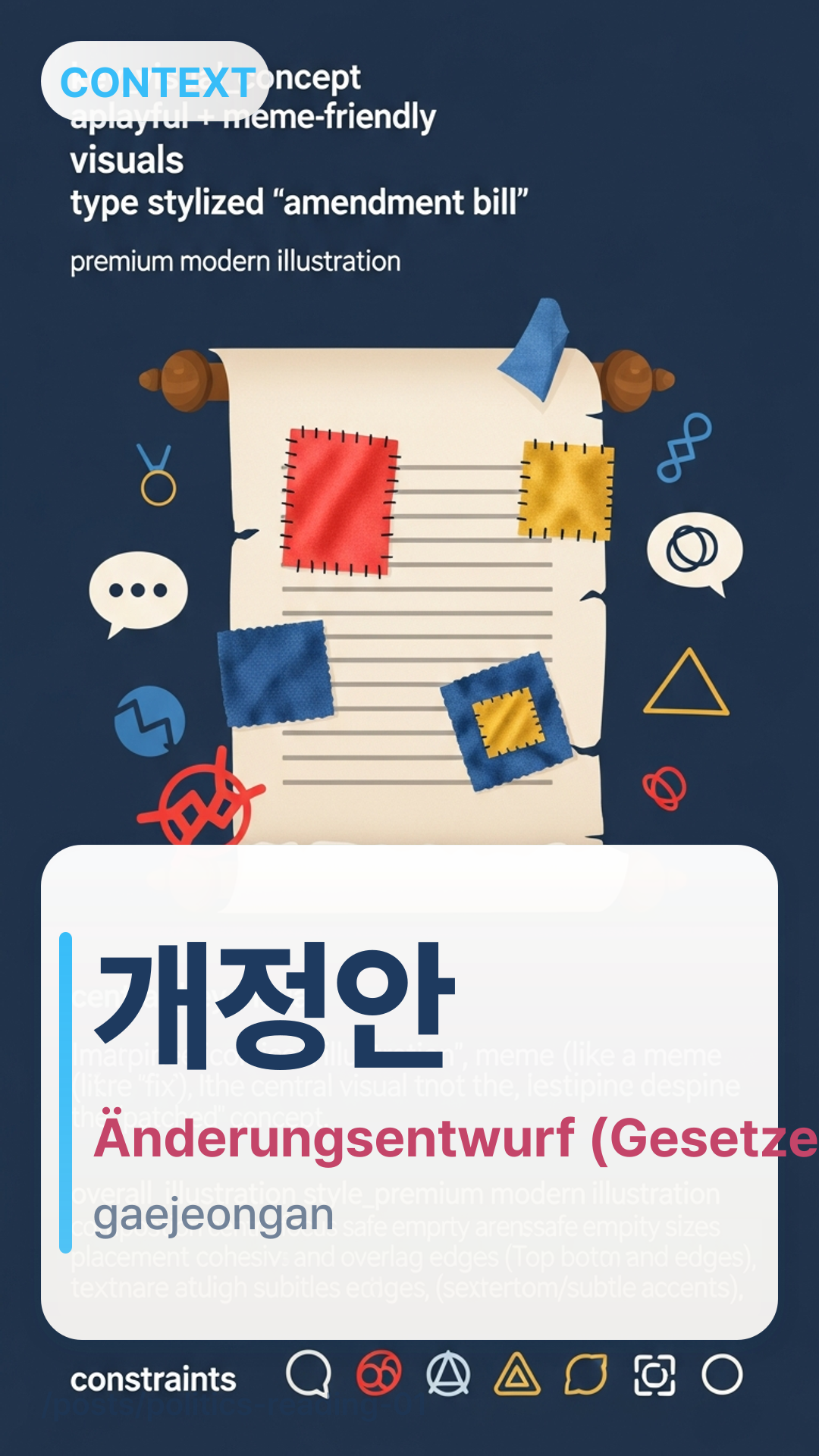 개정안gaejeoan geht um eine vorgeschlagene Änderung, und Headlines behandeln es oft wie ein „Ding, das durch Schritte wandert“. Eine häufige Falle ist, es als „das Gesetz wurde bereits geändert“ zu lesen, obwohl es noch in Prüfung sein kann.