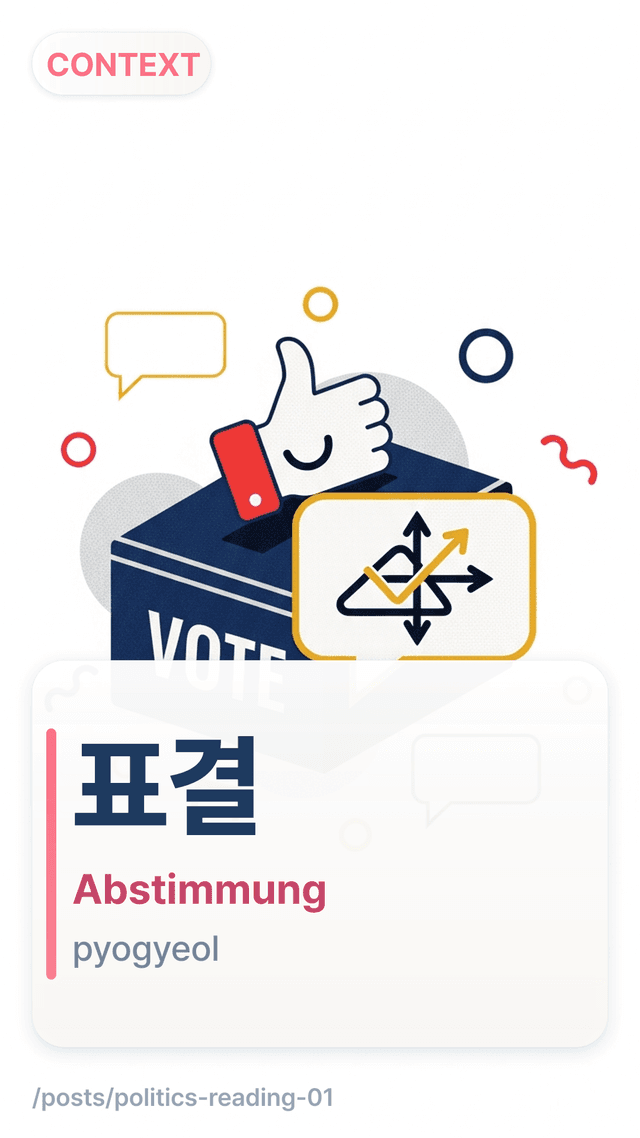 표결pyogyeol ist der Akt (oder der Ergebnis-Kontext) des Abstimmens, und Headlines nutzen es, um einen Entscheidungspunkt zu rahmen. Eine weitere Falle ist anzunehmen, es bedeute dramatisch „alle haben abgestimmt“; es kann sich auch auf Routineabstimmungen beziehen, und das Ergebnis bleibt unklar, solange du keine Wörter wie 가결gagyeol (angenommen) oder 부결bugyeol (abgelehnt) siehst.