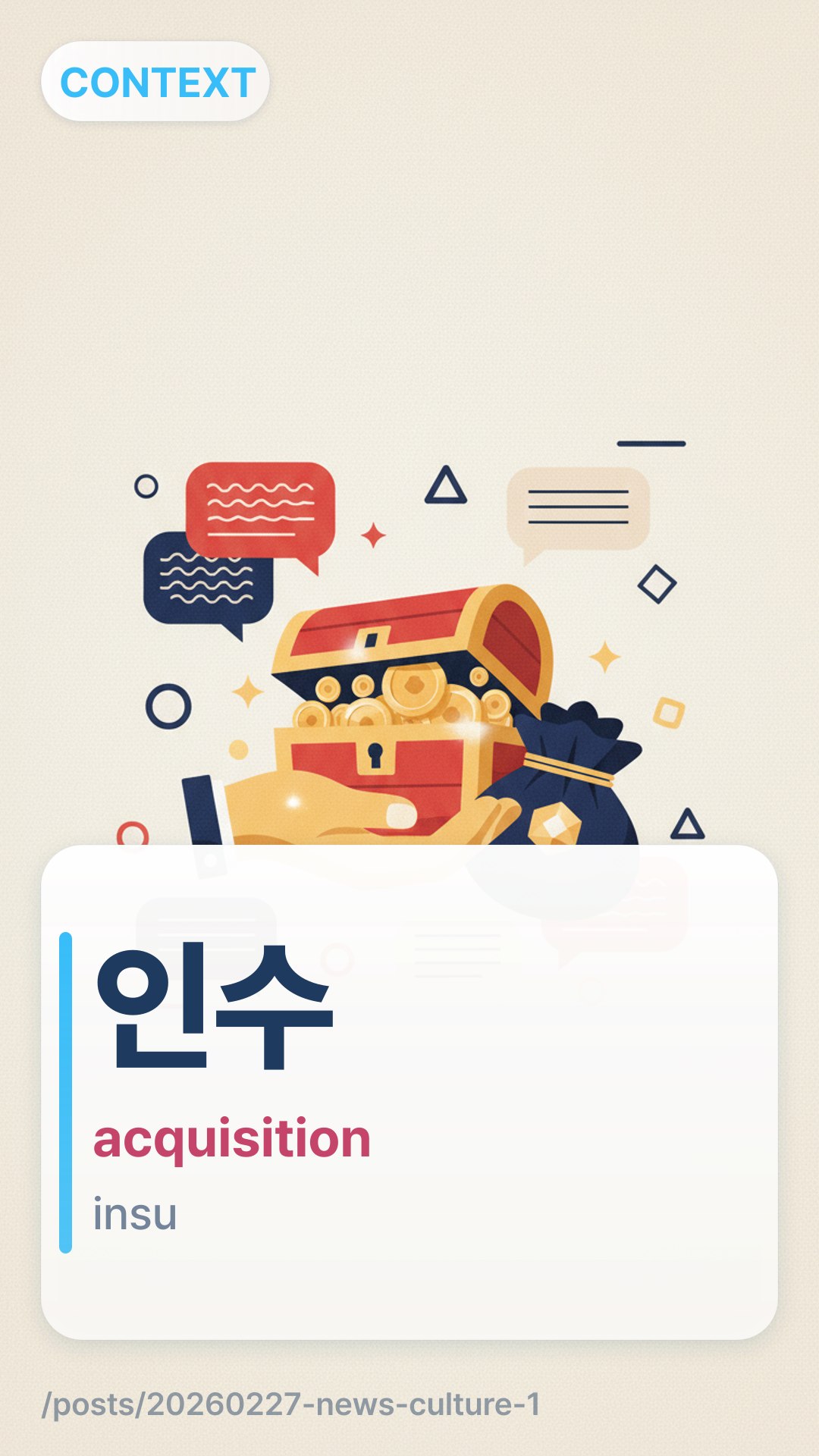 In the context of this news, μΈμinsu (insu) refers to the acquisition or takeover of a company. It is often paired with ν©λ³hapbyeong (hapbyeong - merger) to form the term M&A (μΈμν©λ³).