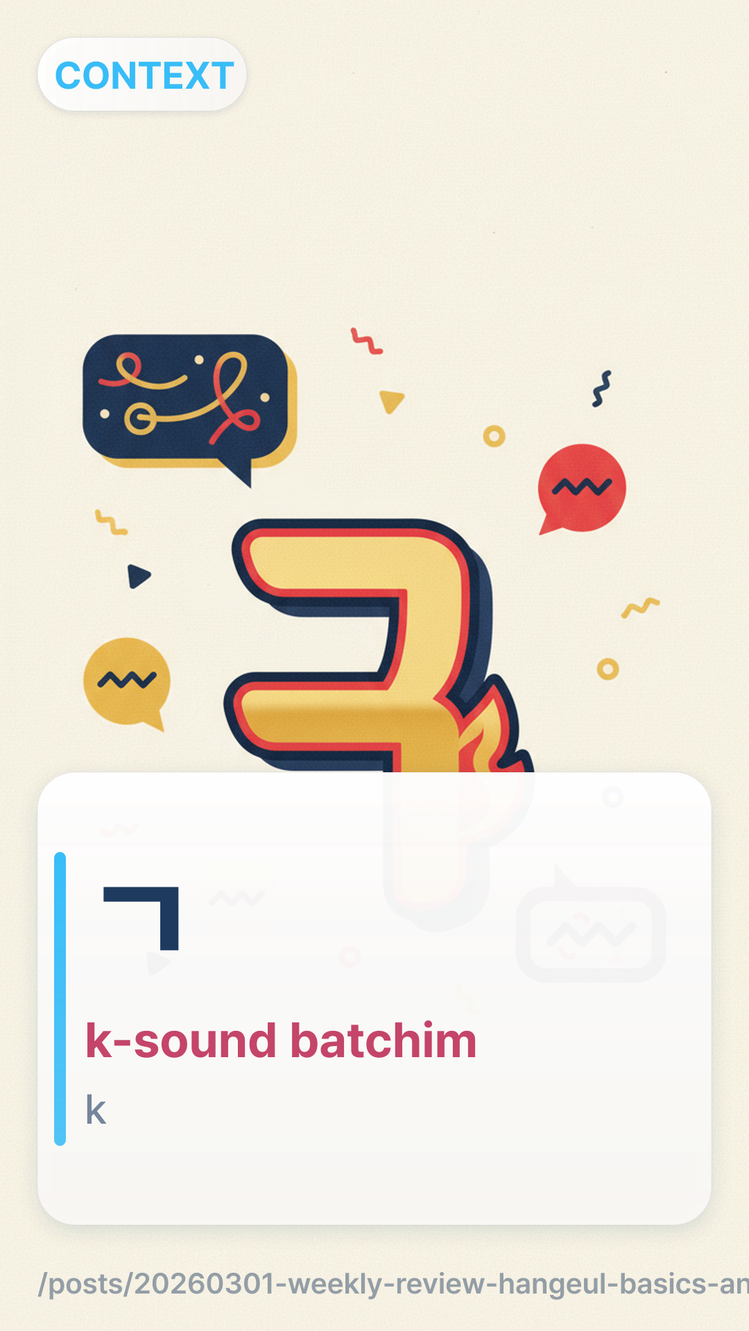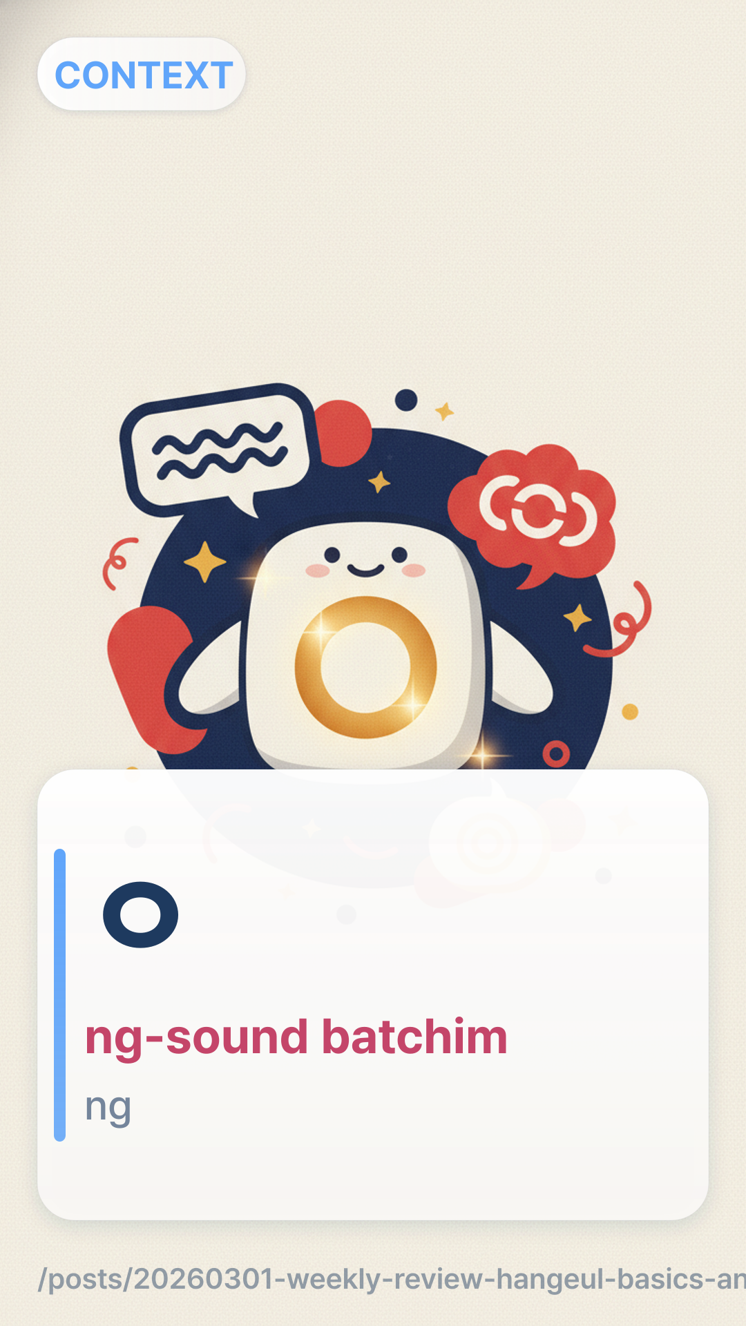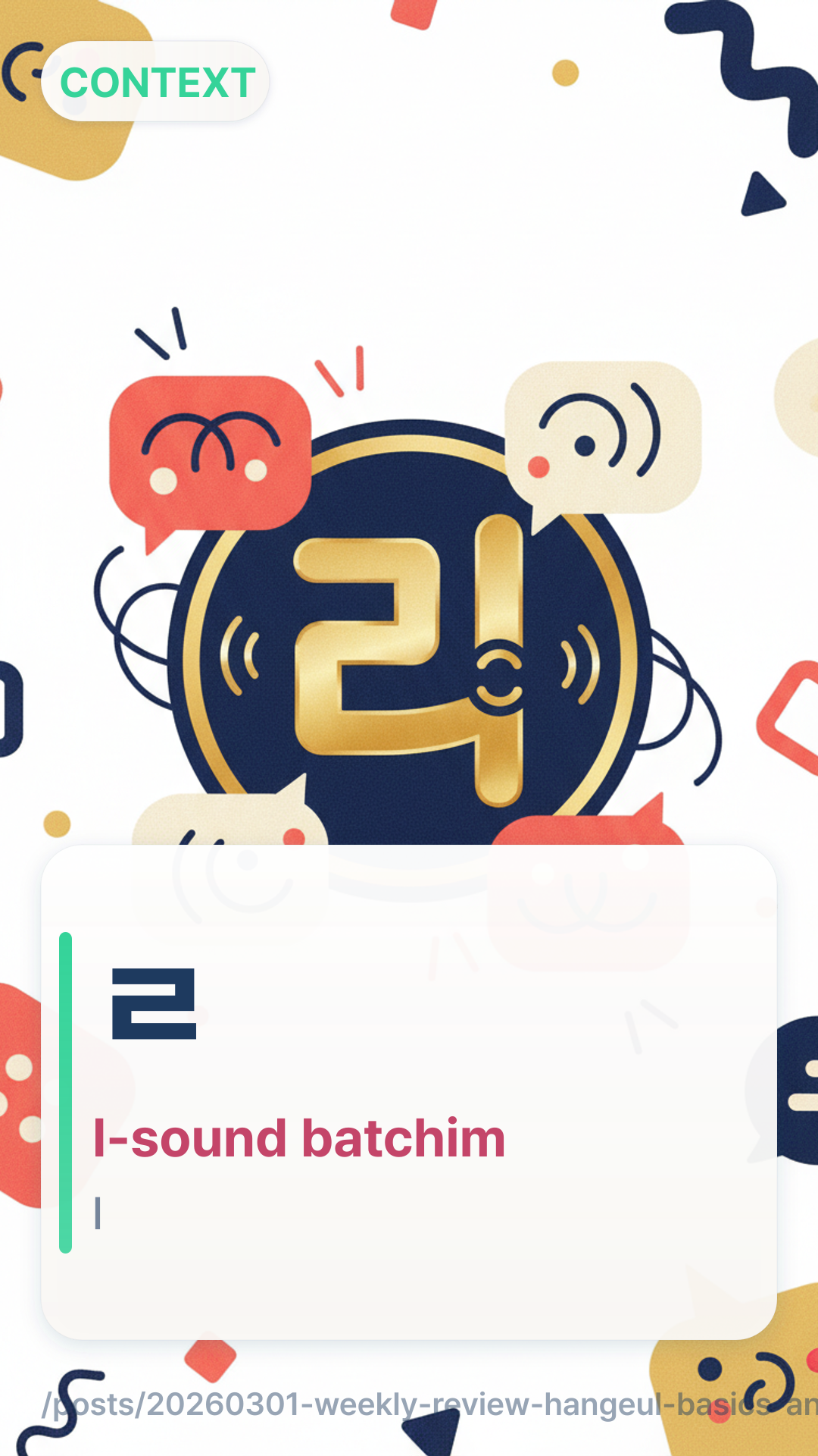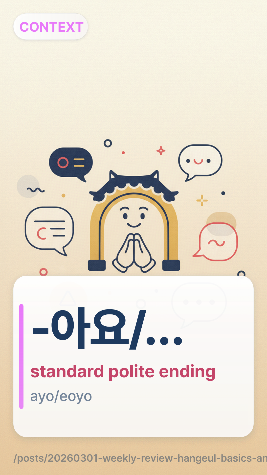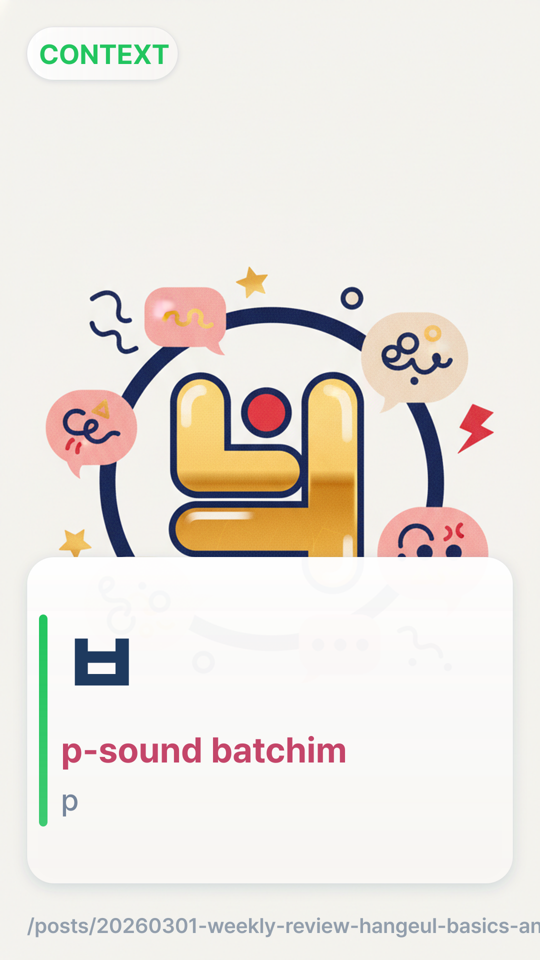 Mastered the 7 representative sounds of Batchim (final consonants) to improve pronunciation accuracy.Distinguished between the standard polite -아요/어요-ayo/eoyo and the high-formal -습니다-seupnida endings.Practiced identifying when to use casual 반말banmal versus polite 존댓말jondaetmal based on social hierarchy.Learned how to introduce yourself formally in professional settings.Explored the nuance of the particle 이/가i/ga versus 은/는eun/neun in basic sentence structures.Flashcards (10)