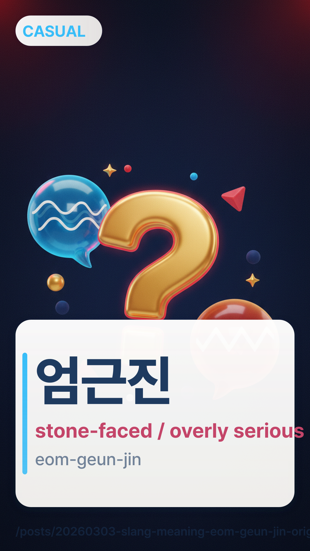 μκ·Όμ§eomgeunjin β Casual/Meme (Teasing someone for being stiff)λ무 μ§μ§ν΄μneomu jinjihaeyo β Neutral (You're being too serious)μ§μ§νμλ€μjinjihasineyo β Polite (You are quite earnest/serious)μκ·Όμ§eomgeunjin is a classic Korean contraction (μ€μλ§) of three words: μ격 (Strict), κ·Όμ (Majestic/Solemn), and μ§μ§ (Serious). It originally started in internet communities to describe celebrities or public figures who maintained a perfectly straight face even in hilarious or chaotic situations.