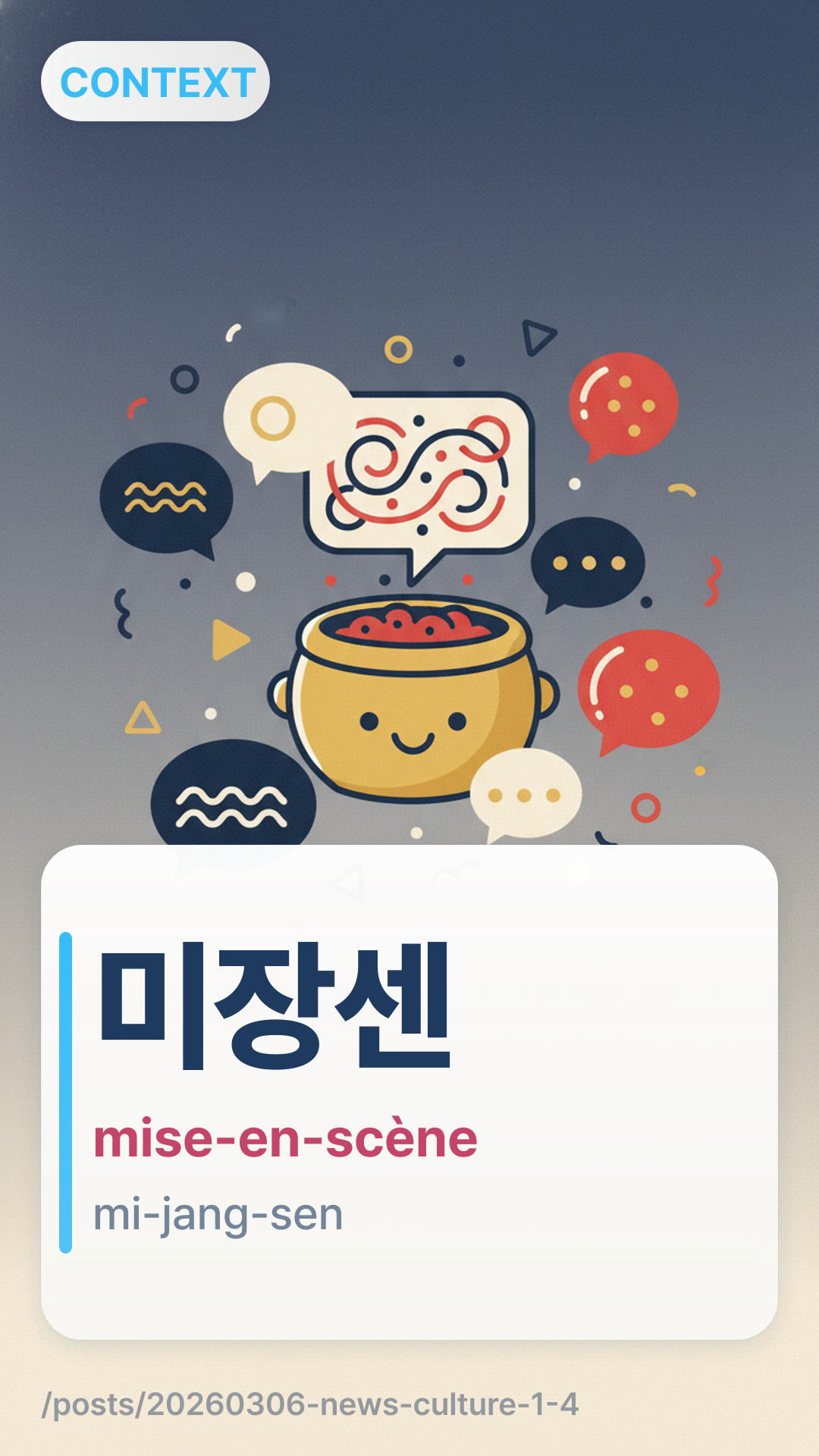 In the context of this article, 미장센mijangsen (mise-en-scène) refers to the arrangement of scenery and stage properties in a play or film. It is the visual information that tells a story without a single line of dialogue.