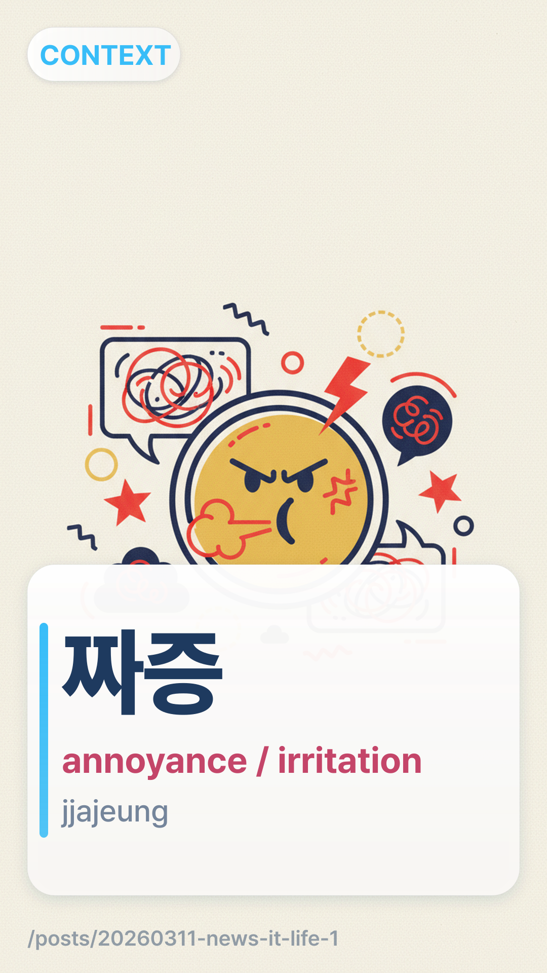 그 소리 진짜 짜증 나.geu sori jinjja jjajeung na. — That sound is really annoying.
