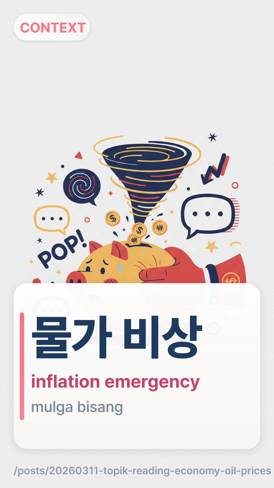 ๊ตญ์ ์ ๊ฐgukjeyuga is the correct subject when discussing price per barrel (๋ฐฐ๋ด๋น).๊ธ๋ฑgeupdeung describes the action of prices rising sharply and suddenly.๋ฌผ๊ฐ ๋น์mulga bisang is the idiomatic expression used when rising costs create a crisis for the public.When skimming Korean news, look for the Hanja character ้ซ (๊ณ - high) or ไธ (์ - up) next to these terms. Headlines often use these shorthand symbols to save space. Practice by checking the 'Economy' section of Naver News once a day to see how many times these three terms appear.