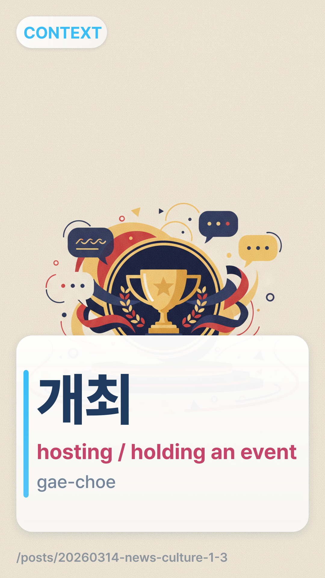 In Korean news headlines, you will frequently see the word κ°μ΅gaechoe (gae-choe). It refers to the act of holding or hosting an organized event, such as a meeting, a sporting event, or a concert.
