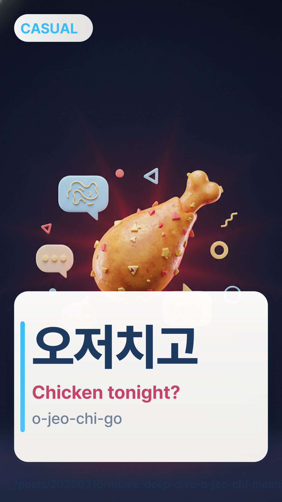 ์ผ๋ก ์นํจ์ ์ด๋ ์ ๊ฐ์?oneul jeonyeogeuro chikineun eotteosingayo? โ Formal/WorkThis is a classic 'Abbreviation of the Abbreviation' (์ค์๋ง). It stands for ์ค๋ ์ ๋ ์นํจ ๊ณ (Today Evening Chicken Go). It became a staple in Korean gaming culture and KakaoTalk chats because, let's face it, chicken is the unofficial national dish of Korea.