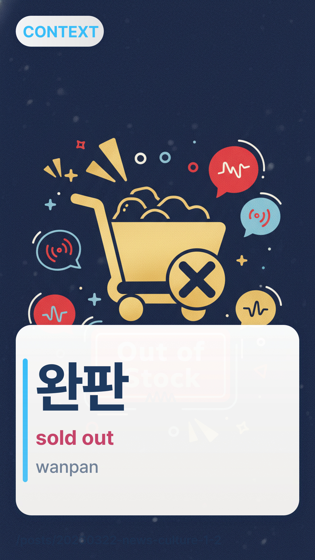 μνwanpan (wan-pan) is a shorthand for μμ νλ§€wanjeon panmae (wan-jeon pan-mae), which literally translates to "complete sale." In modern Korean culture, it is used to describe products, tickets, or fashion items that sell out instantly due to high popularity or a "celebrity effect."