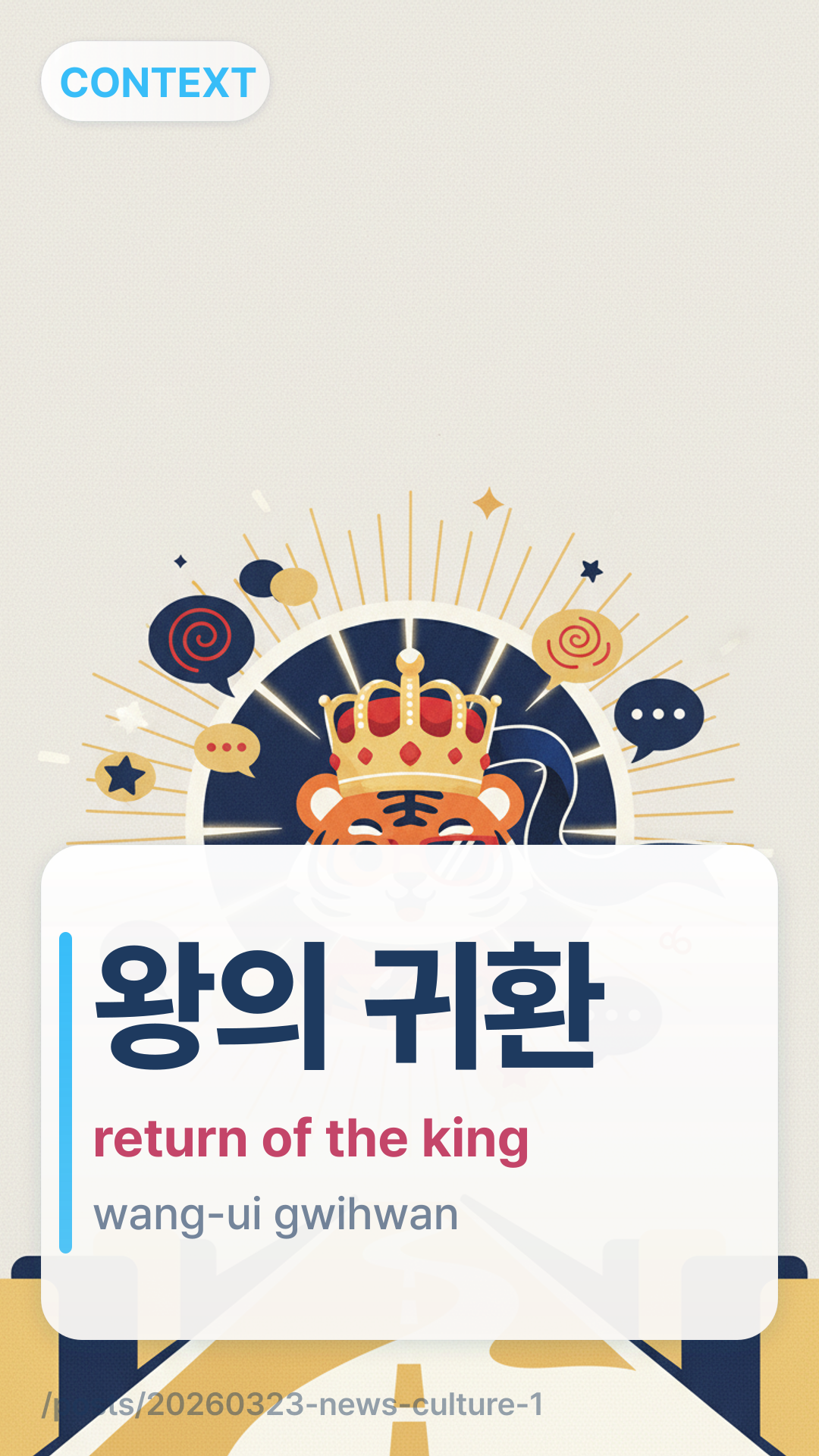 μμ κ·νwaui gwihwan (Wang-ui Gwihwan) literally translates to 'Return of the King.' In Korean media and fan culture, this phrase is used to describe the comeback of a legendary artist or a top-tier group after a long hiatus. It implies that the artist is reclaiming their 'throne' at the top of the industry.