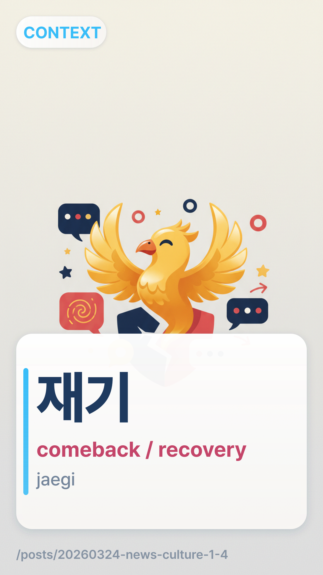 In the context of the news, ์ฌ๊ธฐjaegi (jae-gi) refers to a "comeback" or "recovery" after a period of failure, slump, or absence from the public eye. It is often used for athletes returning from injury or celebrities returning after a scandal.
