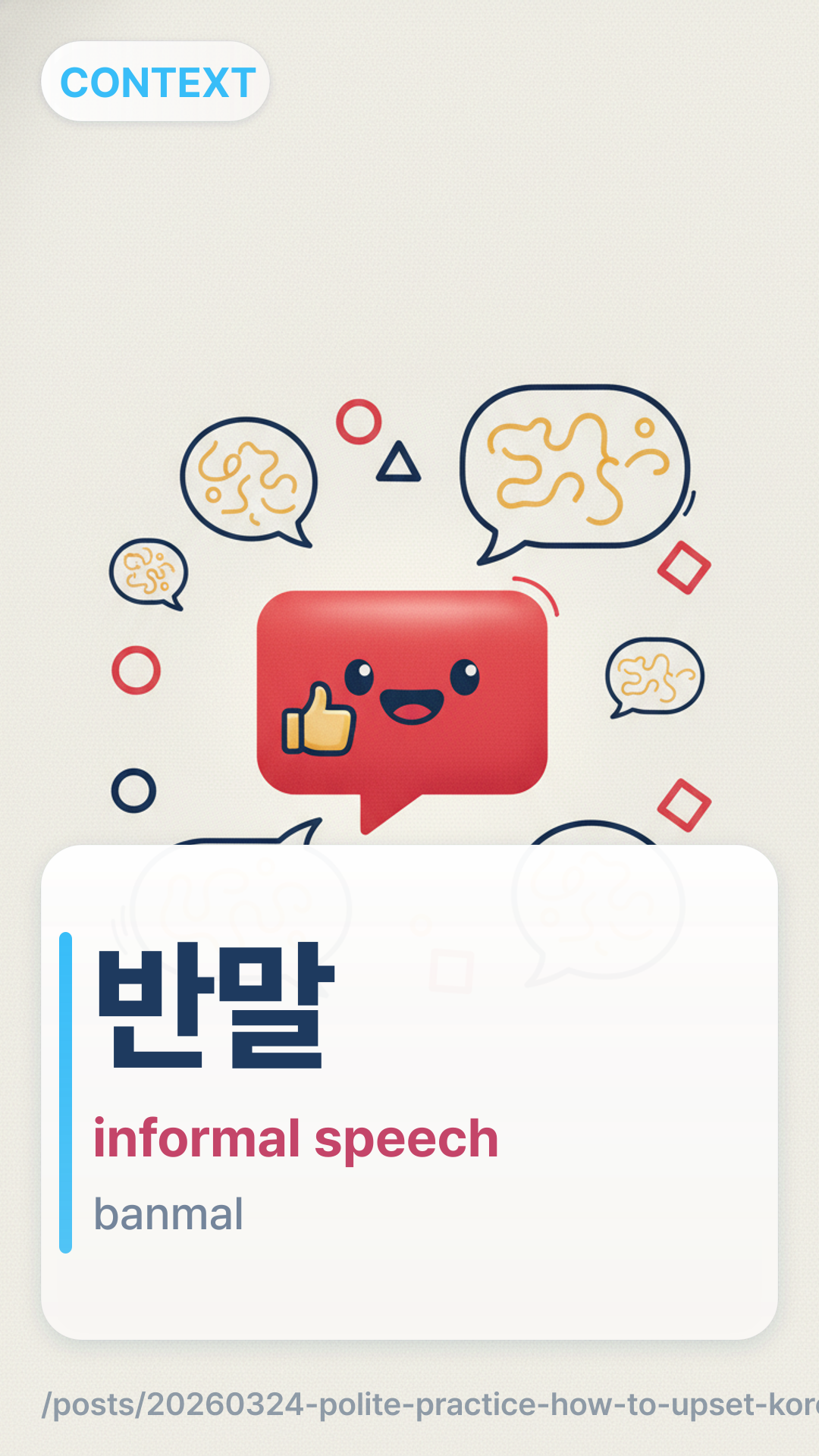 λ°λ§banmal (Banmal) literally translates to 'half-speech.' It is the informal register of the Korean language. Using it implies a high level of intimacy, a lack of social distance, or a clear hierarchical superiority (like a parent to a child). When used correctly, it feels warm and close; when used incorrectly, it feels like a deliberate slap in the face to the listener's status.
