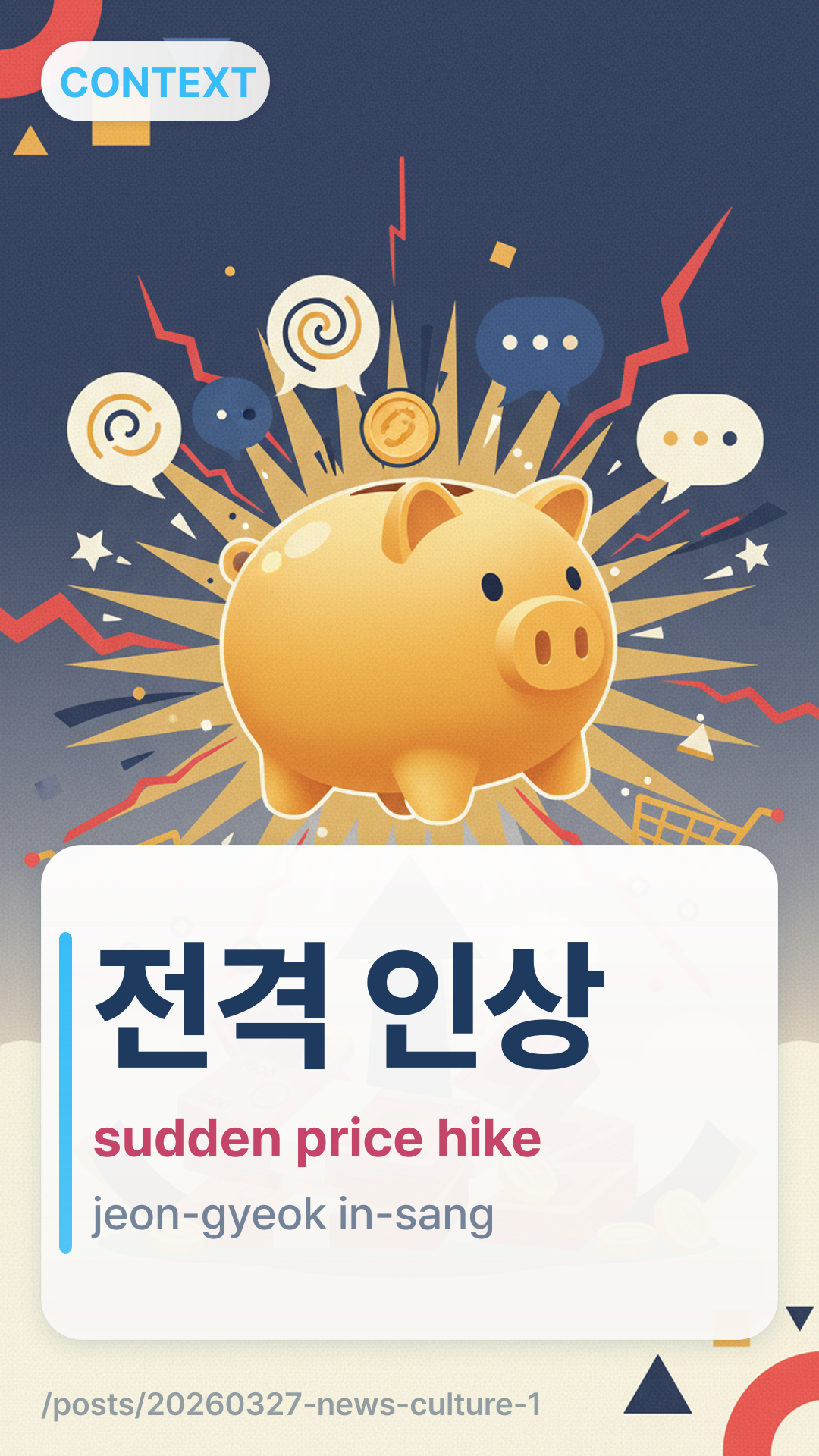 μ 격 μΈμjeongyeok insang (jeon-gyeok in-sang) refers to a "sudden" or "surprise" price hike. It is a combination of μ 격jeongyeok (lightning bolt/sudden/surprise) and μΈμinsang (increase/hike). You will often see this in economic news when a company raises prices without prior warning or much earlier than expected.