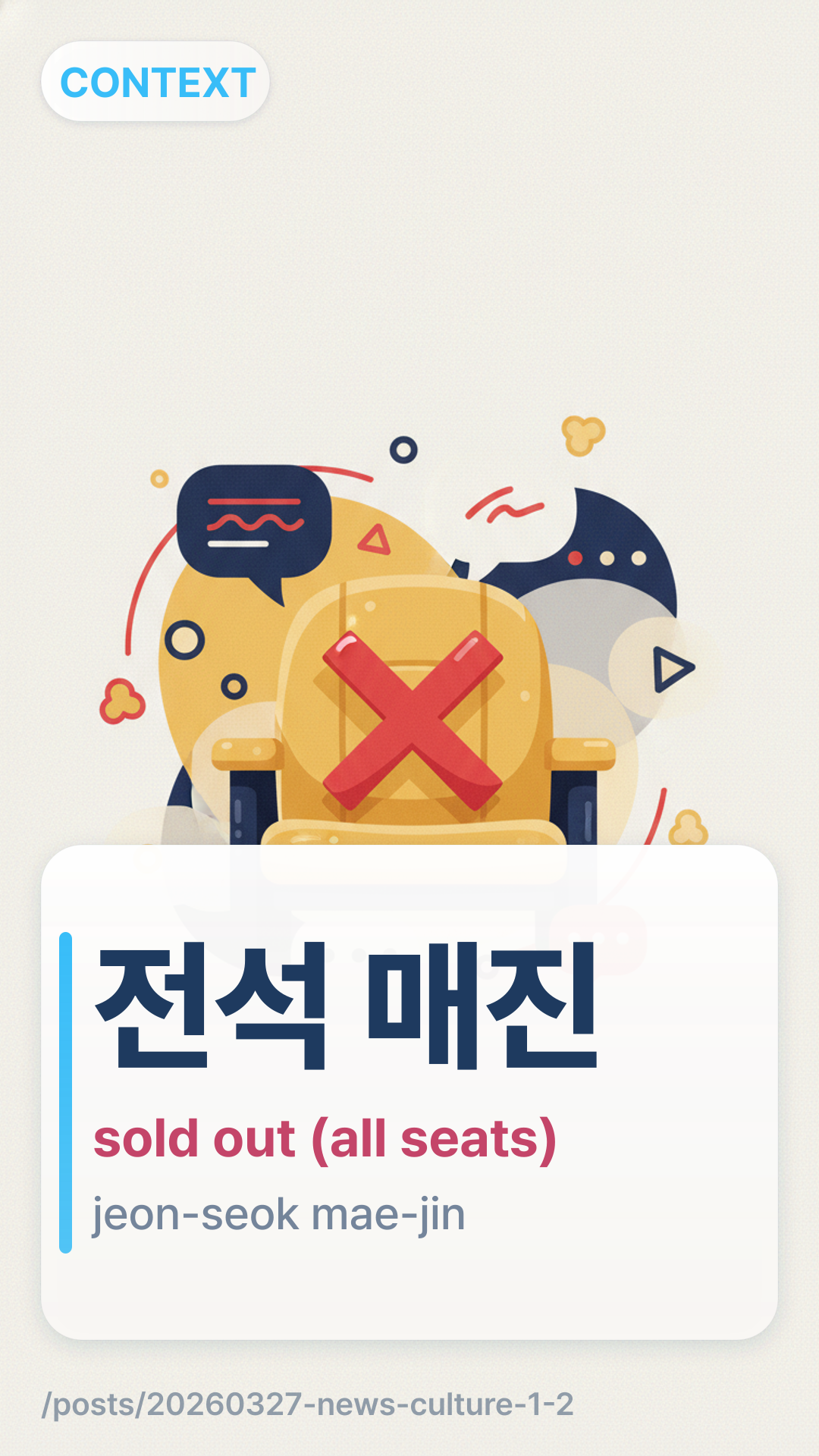 μ μ λ§€μ§jeonseok maejin (jeon-seok mae-jin) refers to a "complete sell-out" of all available seats in a venue. It is a compound of μ μjeonseok (all seats) and λ§€μ§maejin (sold out). You will see this term constantly in Korean entertainment news regarding concerts, musicals, and fan meetings to indicate a show's commercial success.
