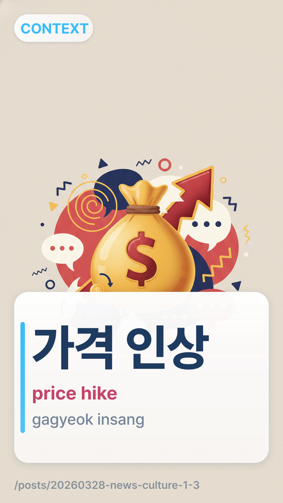 ๊ฐ๊ฒฉ ์ธ์gagyeok insang (gagyeok insang) refers to a "price hike" or "price increase." It is a formal term used frequently in news headlines regarding the economy, retail, and service industries. ๊ฐ๊ฒฉgagyeok means price, and ์ธ์insang means a raise or lift.