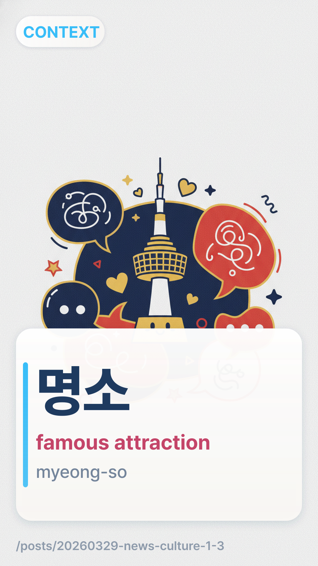 μmyeongso (myeong-so) refers to a famous place or a well-known tourist attraction. It is often used to describe locations that are 'must-see' spots due to their beauty, history, or pop-culture significance.