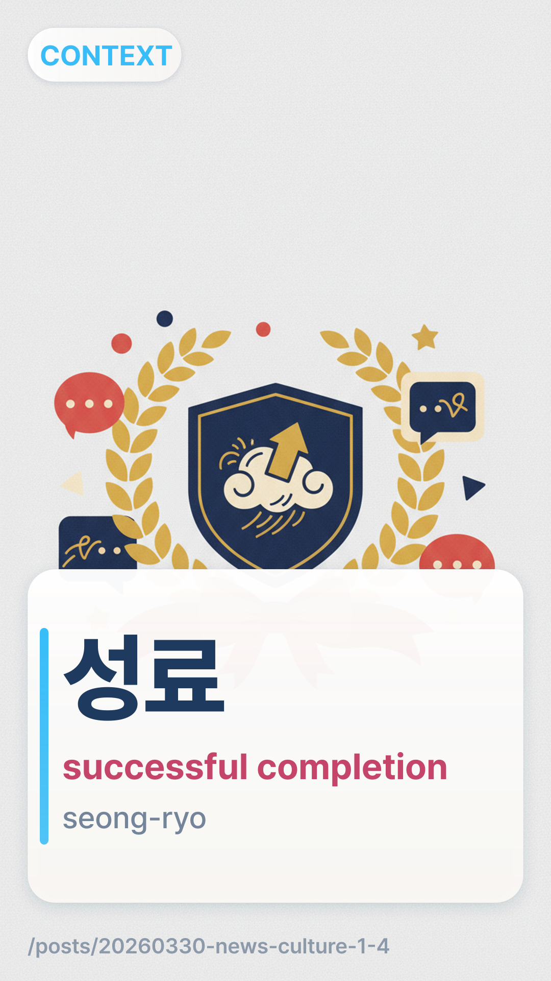 When reading Korean entertainment news, look for the suffix -μ±λ£-seongryo in headlines to quickly identify successful event wrap-ups. It is a formal Hanja-based term (ζε + η΅δΊ) that you won't often hear in casual conversation, but it is essential for understanding media reports.