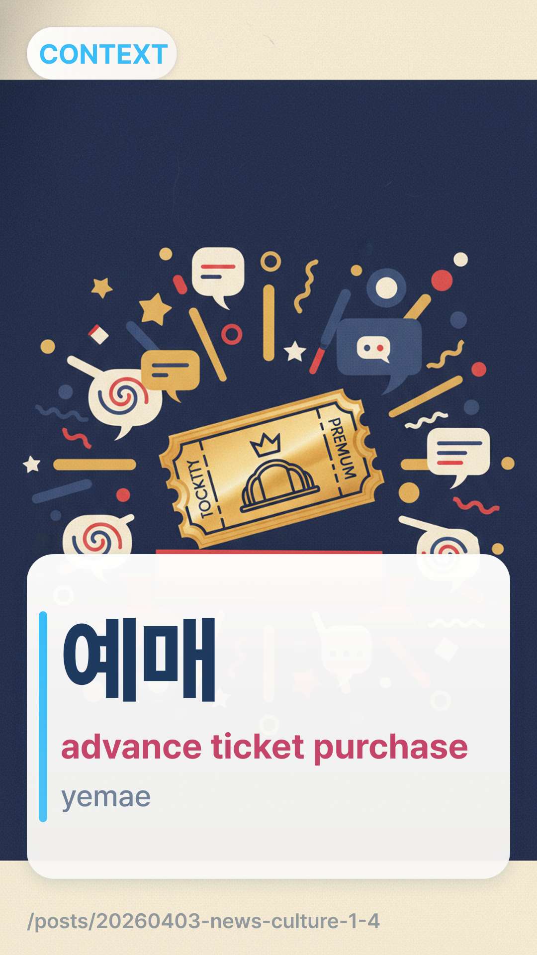 (yemae) refers to the act of purchasing tickets in advance. While (yeyak) is a general word for any reservation (like a restaurant), is specifically used when you pay for a physical or digital ticket beforehand, such as for movies, concerts, or train rides.