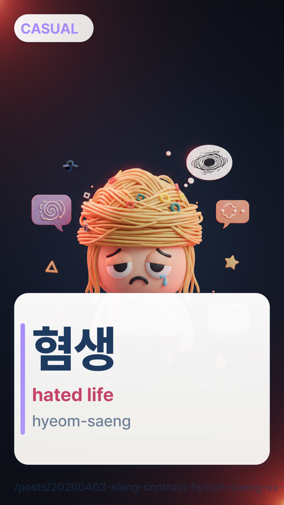 Compare 현생 (real life) and 혐생 (hated life). Learn how to express burnout and daily responsibilities in Korean slang. Master the misery scale!