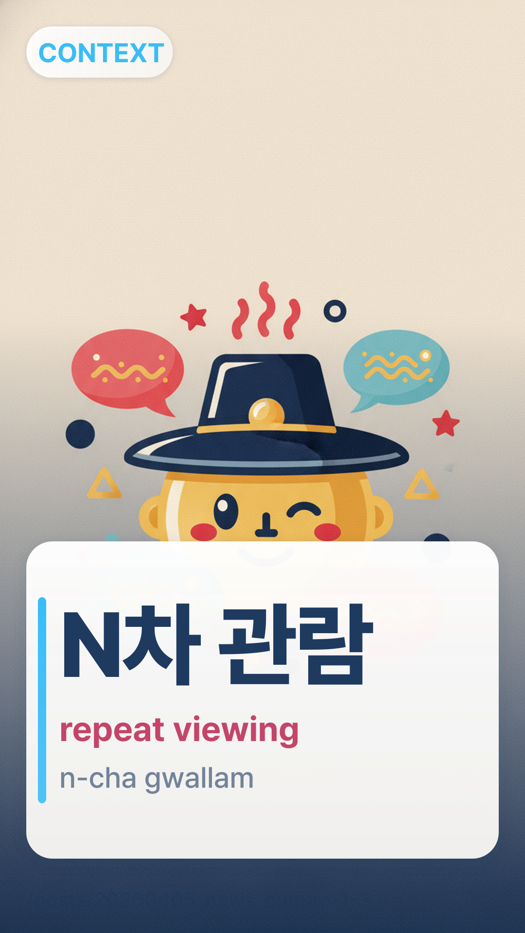 N์ฐจ ๊ด๋Ncha gwanram (N-cha gwallam) refers to the act of watching the same movie multiple times in a theater. The 'N' represents an algebraic variable for any number, and 'cha' is a counter for 'times' or 'rounds.' It is a common term used in Korean fandom culture to describe 'repeat viewing' or 'multi-viewing.'