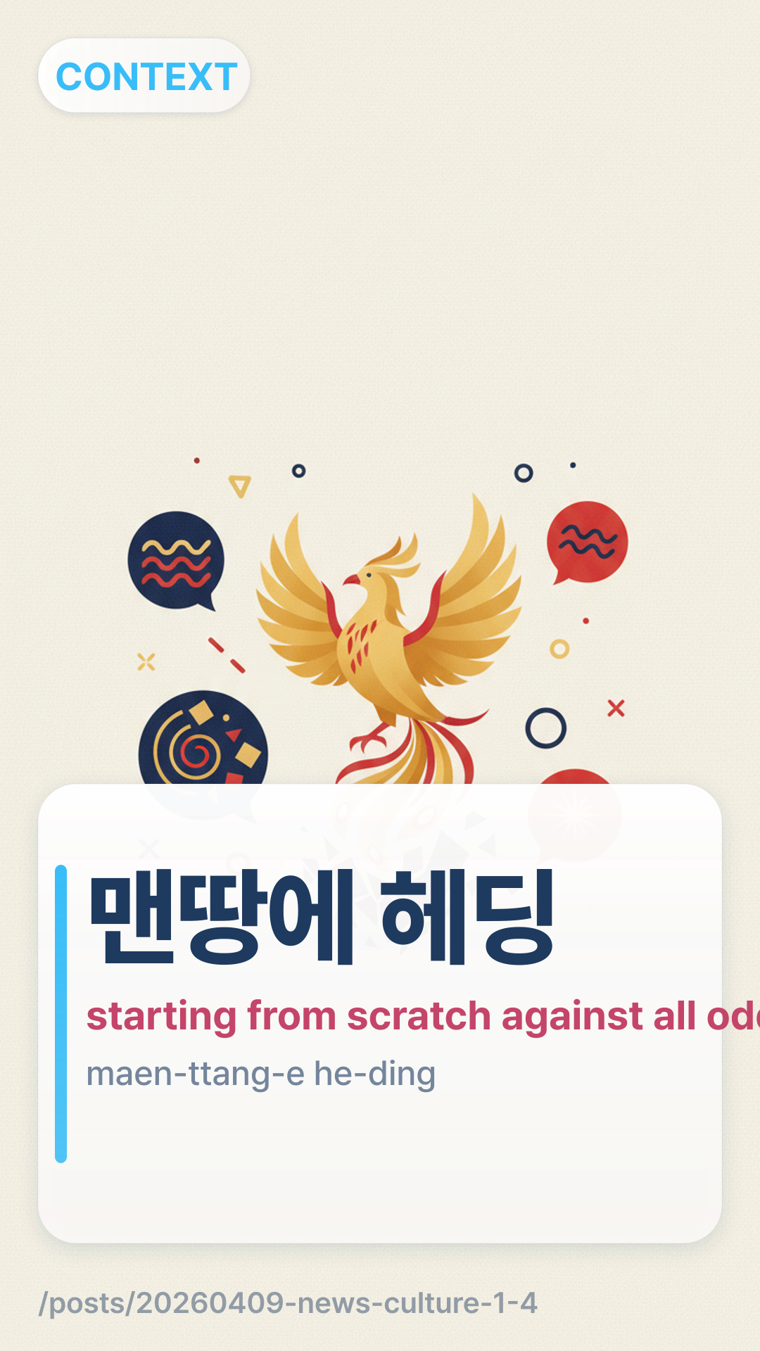 In the article, the phrase (maen-ttang-e he-ding) is used to describe the city's initial struggles. It literally translates to "heading (the ball) on bare ground." It is a common idiomatic expression used when someone starts something from scratch without any foundation, resources, or help, often facing great difficulty or a seemingly impossible task.