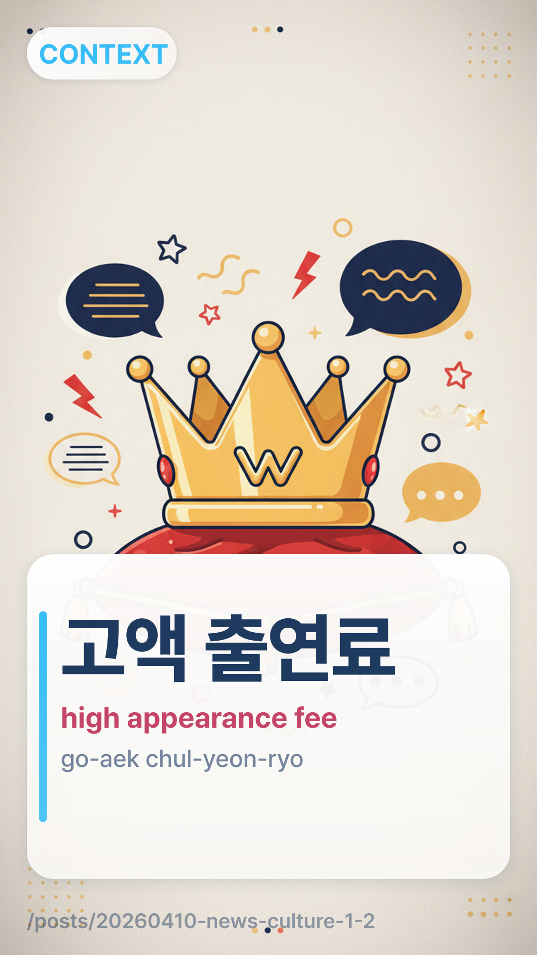 ๊ณ ์ก ์ถ์ฐ๋ฃgoaek churyeonryo (go-aek chul-yeon-ryo) refers to "high-sum appearance fees" or exceptionally high salaries paid to performers, typically lead actors in dramas or films. In the current Korean media context, it specifically points to the inflationary trend caused by global OTT platforms.