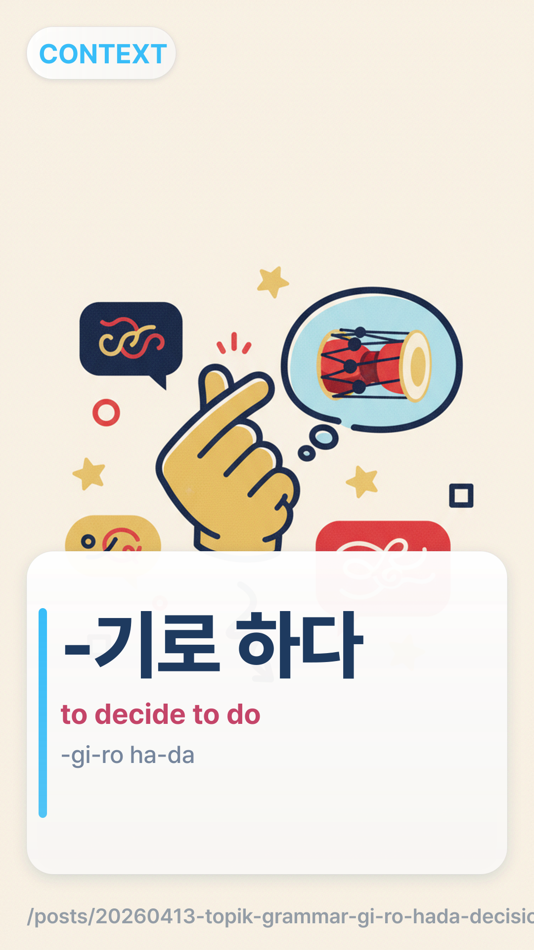 Master the TOPIK grammar -๊ธฐ๋ก ํ๋ค to express firm decisions. Learn the difference from -๋ ค๊ณ ํ๋ค with examples and a mini-quiz.