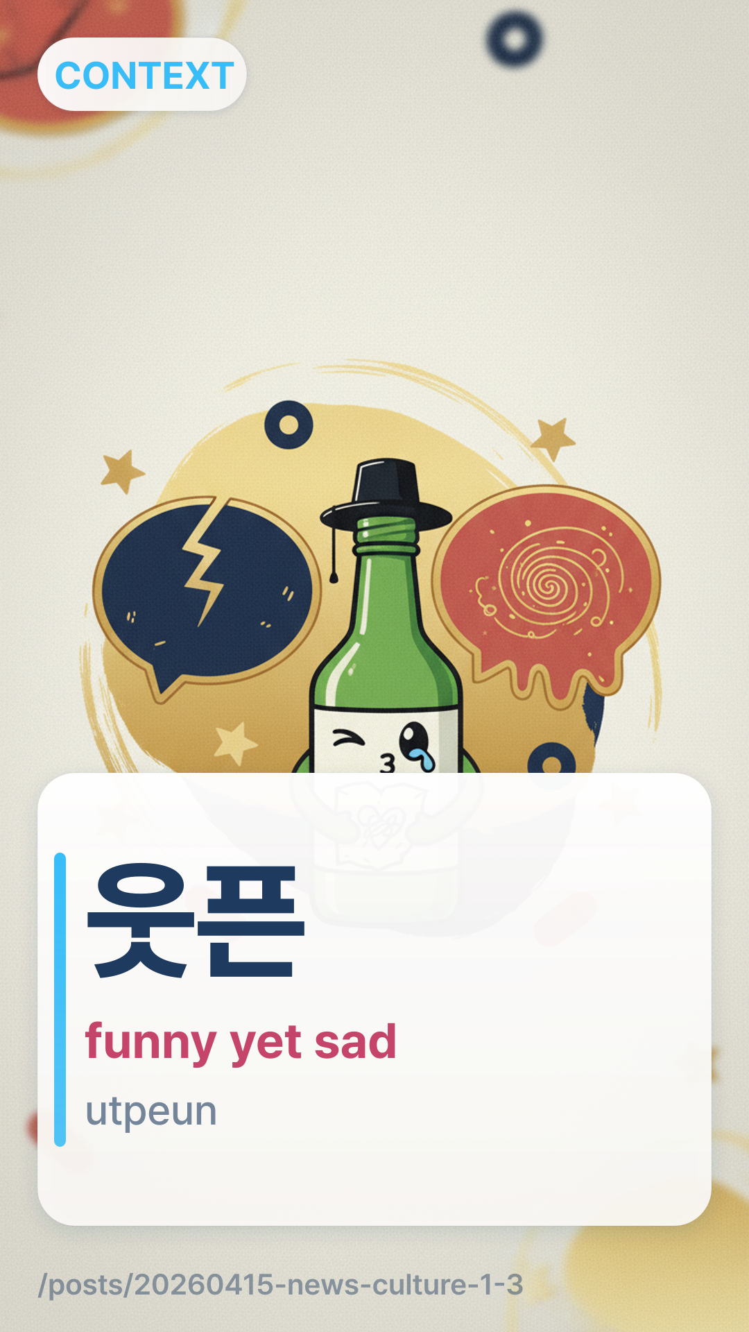 This term is a combination of '웃기다' (funny) and '슬프다' (sad). It describes a situation that is simultaneously hilarious and pathetic or tragic, often used to describe the 'struggle' of daily life or the relatable failures of characters in movies and dramas.