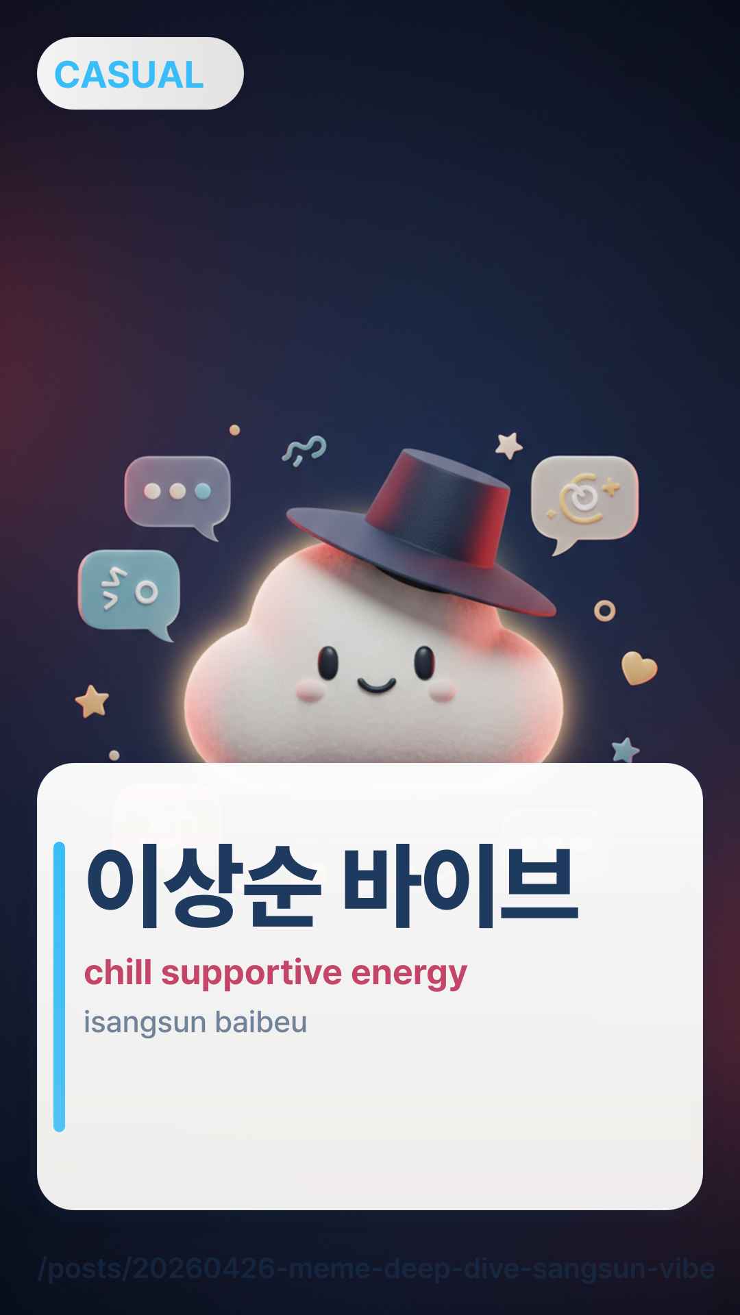 Try identifying the 'Sang-sun' in your friend group today. The next time someone stays calm during a minor crisis (like a missed bus or a rain shower), tell them: 너 진짜 이상순 바이브 있다!neo jinjja isangsun baibeu itda!