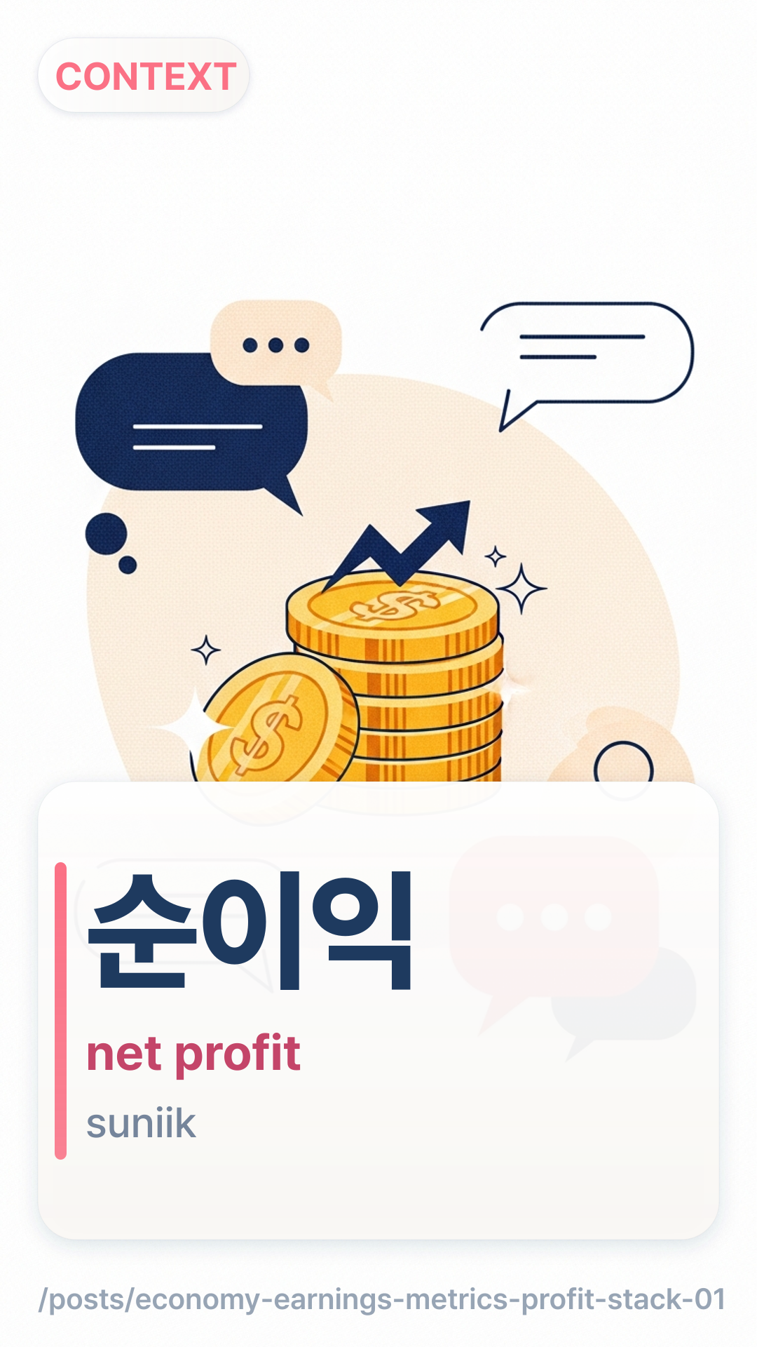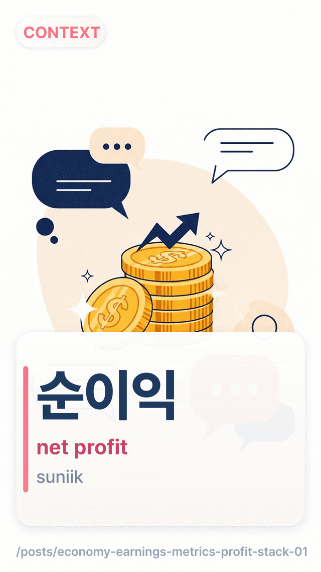 일회성 요인으로 순이익이 크게 늘었습니다.ilhoeseong yoineuro suniigi keuge neureotseupnida. — Net profit jumped due to one-off factors.순이익 적자 전환suniik jeokja jeonhwan — A swing to a net loss.영업이익이 좋아도 순이익은 다르게 나올 수 있습니다.yeoeobiigi johado suniigeun dareuge naol su itseupnida. — Even with strong operating profit, net profit can look different.