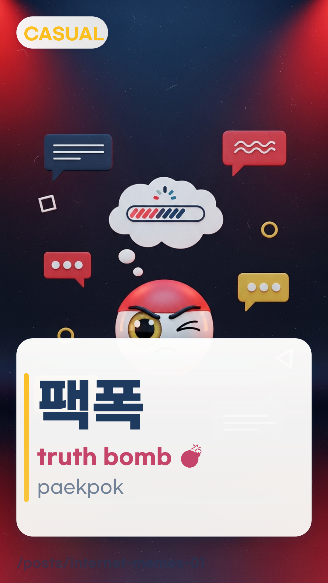 What does 팩폭 mean? Short for 팩트 폭격 (fact bombing)—dropping a harsh truth that stings.