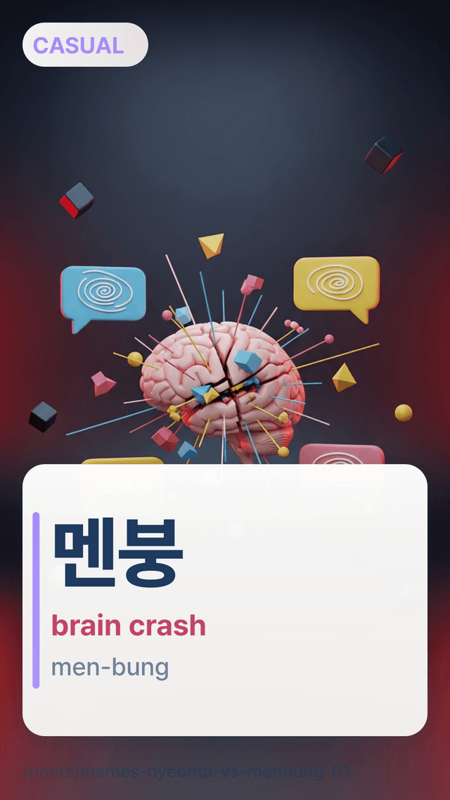 The trap: 멘붕menbung is not “I’m sad.” If you’re simply disappointed or drained, 현타hyeonta (or just 우울하다uulhada in neutral speech) is usually clearer.