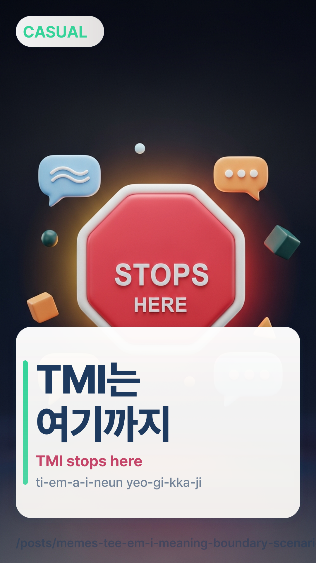 TMI는 여기까지tiemaineun yeogikkaji literally means “TMI up to here.” It’s a clean closer: you’re ending the overshare segment without attacking the person. It’s especially handy when you want to stay friendly (family, date) but still stop.