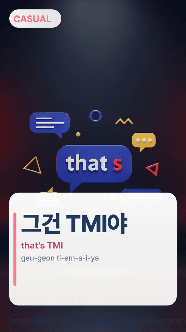 그건 TMI야geugeon tiemaiya is the “boundary” version: “That’s TMI.” It’s direct but still common in everyday talk. To keep it kind, add a redirect right after it. Trap: saying only 그건 TMI야geugeon tiemaiya with no follow-up can feel like a shutdown.