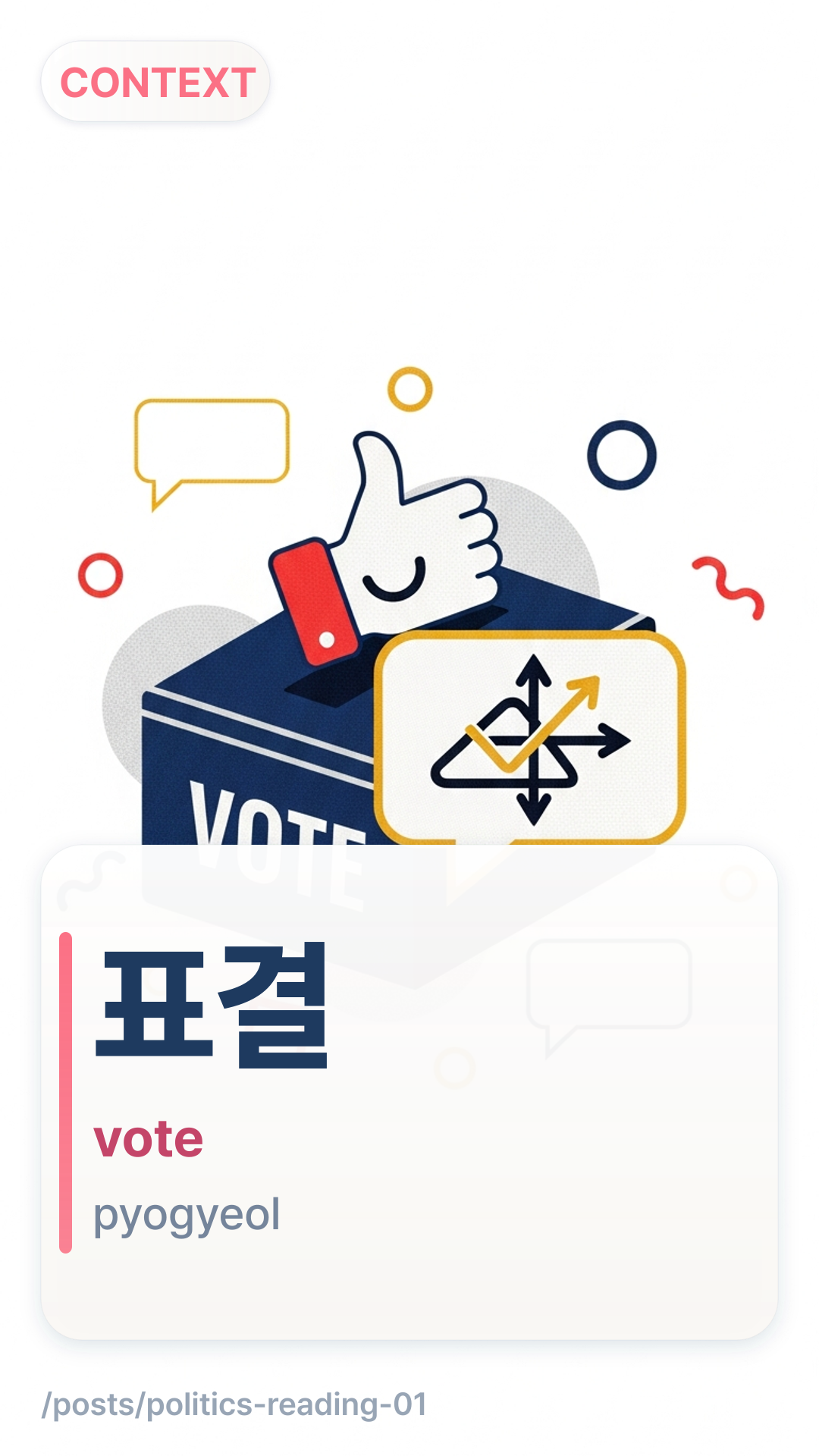 표결pyogyeol is the act (or result) of voting, and headlines use it to frame a decision point. Another trap is assuming it means “everyone voted” in a dramatic sense; it can refer to routine votes, and the result may be unclear unless you see words like 가결gagyeol (passed) or 부결bugyeol (rejected).