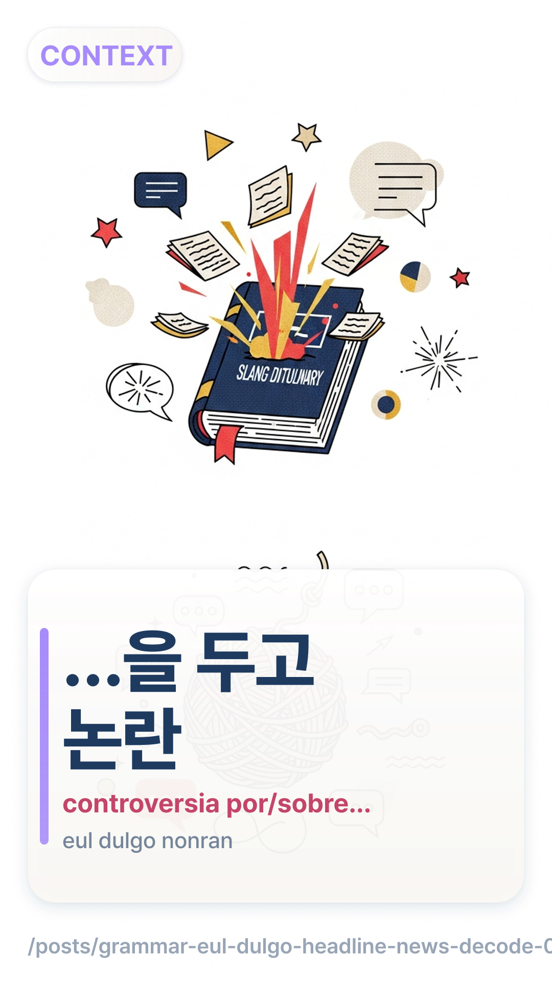 …을 두고 논란…eul dugo nonran — controversia por/sobre……을 두고 논란 확산/가열…eul dugo nonran hwaksan/gayeol — la controversia se extiende/se intensifica