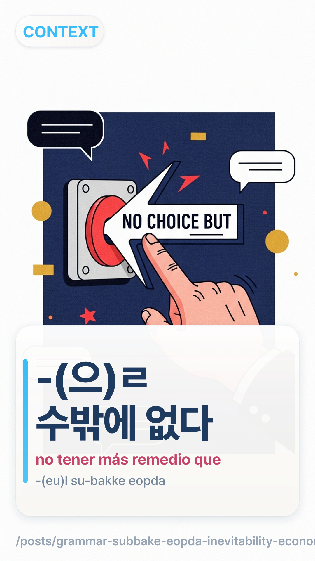 Domina -(으)ㄹ 수밖에 없다 vs -(으)ㄹ 수 없다 con microtitulares, un árbol de decisiones y ejercicios de reescritura: suena inevitable, aprende.