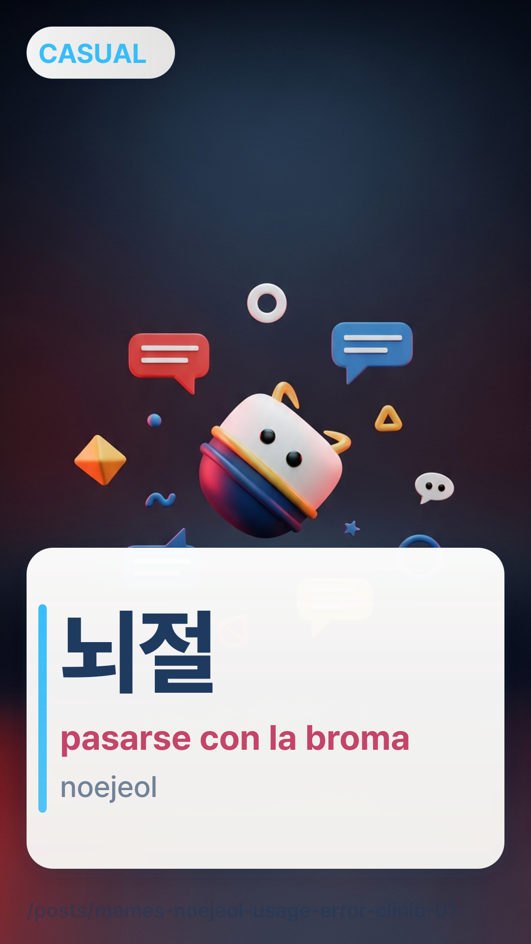 Esto es una clínica de errores: el objetivo no es “usar más jerga”, sino “decir lo mismo sin congelar el ambiente”. Yo lo aprendí por las malas cuando un amigo respondió solo con ... en un chat grupal: mi 뇌절noejeol “en broma” cayó como un regaño.