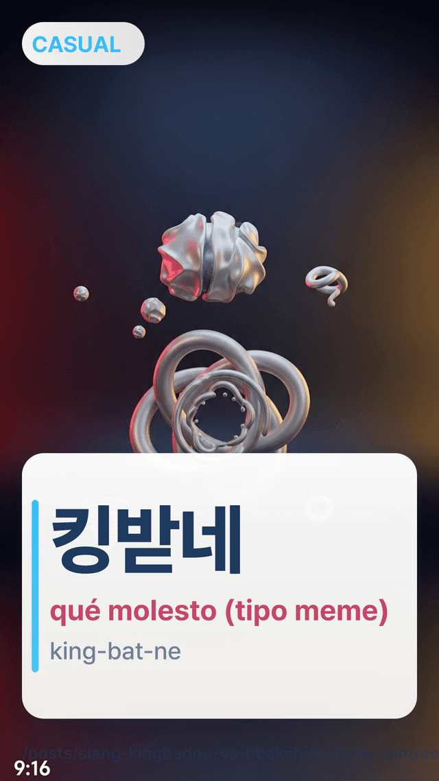 Usa 킹받네kingbatne cuando quieras mostrar irritación sin sonar como si fueras a iniciar una pelea. A menudo se siente como medio broma, medio queja—común en chats grupales.