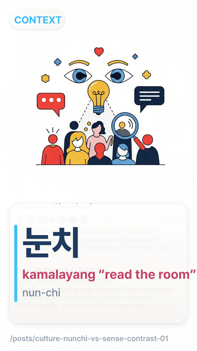 May maliit na sandaling naaalala ko mula sa unang buwan ko sa Seoul: nagdala ako ng “nice” na surprise snack sa study meetup… tapos napansin ko later na maingay, makalat, at mahirap i-share. Mabait pa rin ang mga tao, pero yung vibe ang nagturo sa akin ng pagkakaiba ng 눈치nunchi (hindi gumawa ng dagdag na abala) at 센스senseu (pagdagdag ng ginhawa).