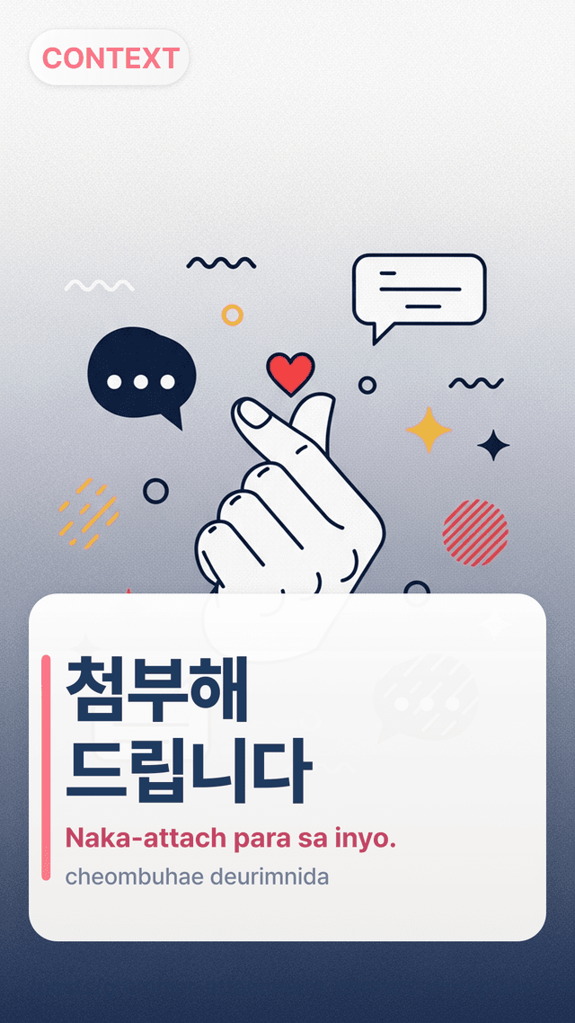 Noong unang linggo ko na nagme-message sa isang opisina sa Seoul, sinulat ko ang 파일 첨부드립니다.pail cheombudeuripnida. at may gentle na correction: sa Korean, kadalasan hindi mo na ina-announce ang “file” nang ganoon—ang pagpili mo ng pandiwa ang nag-iimply na nito.