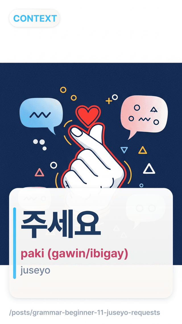 Mga pattern ng pakiusap (주세요/좀/부탁드려요) na itinuturo gamit ang totoong mini templates: cafe, paghingi ng tulong, direksyon.