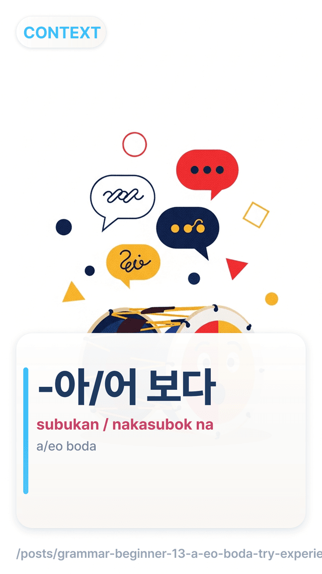 Ayusin ang -아/어 보다 (subukan vs nakasubok na) gamit ang 3-branch chooser, mga rewrite sa “see,” at 한 번 drills—para mas maging natural at tama.