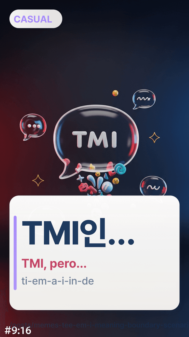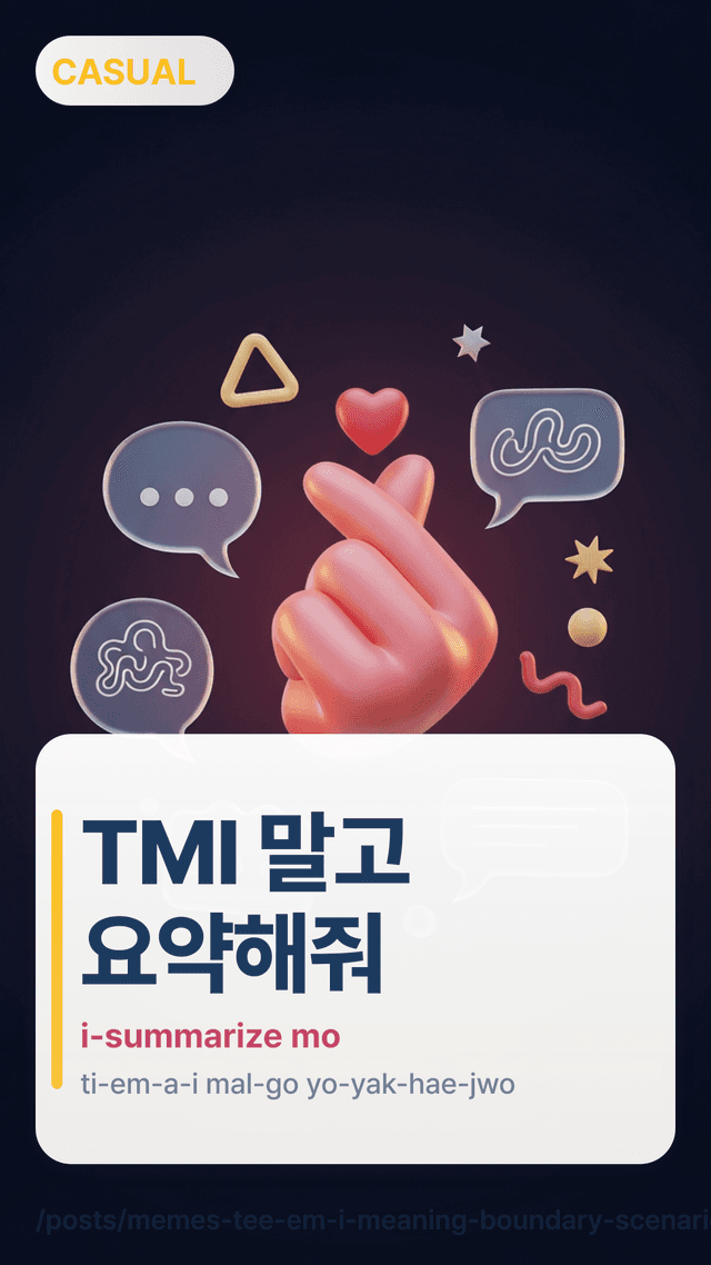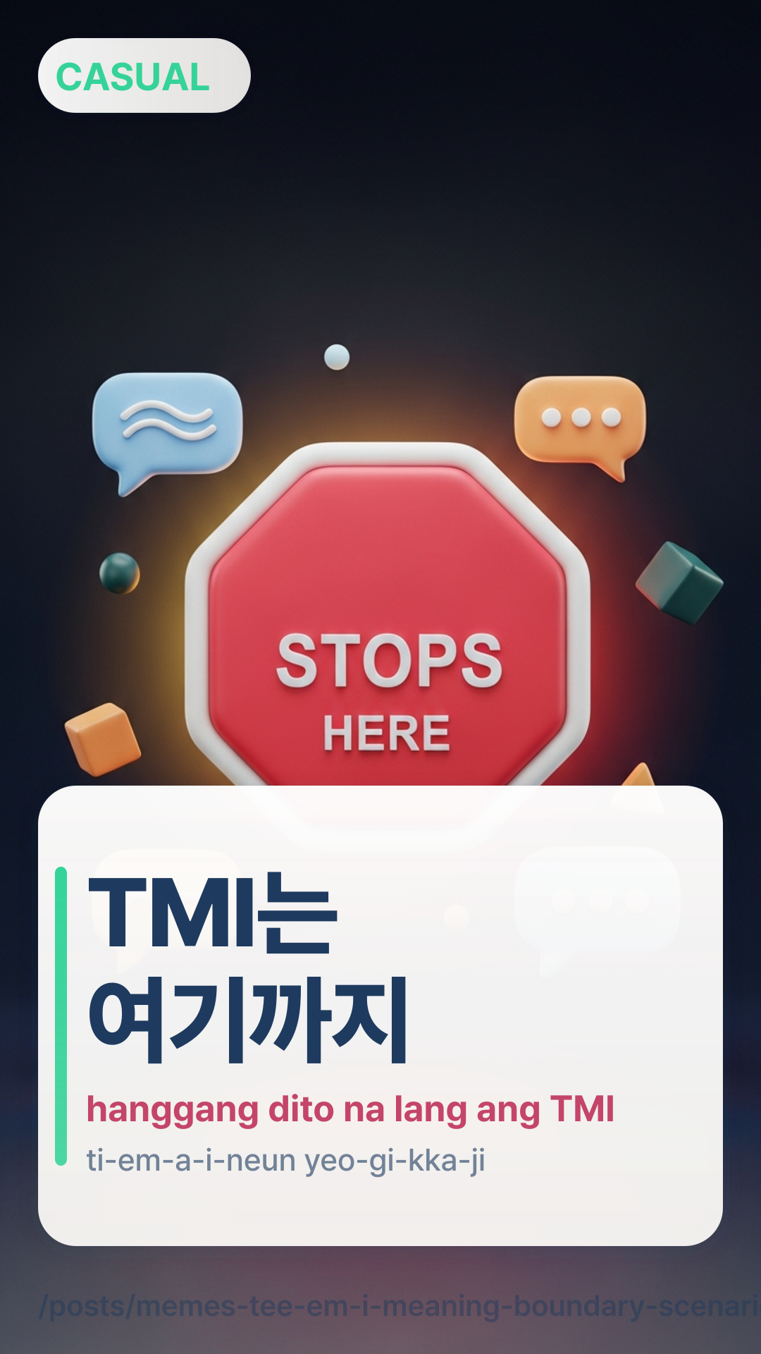 Ang TMI ay Korean chat meme na hiniram mula sa English na “Too Much Information.” Sa Korea, madalas itong magaan ang gamit, parang “fun extra details,” pero puwede rin itong mangahulugang “sobrang personal / hindi kailangan.” Karaniwang patibong: iniisip ng learners na palaging bastos ang tunog nito. Depende ito sa tono at relasyon.