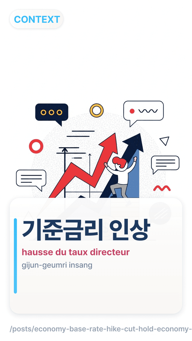 기준금리 25bp 인상gijungeumri 25bp insang — Hausse de 0.25 point de pourcentage.연 3.50%→3.75%yeon 3.50%→3.75% — Le niveau passe de 3.50% à 3.75%.기준금리 동결…연 3.50% 유지gijungeumri donggyeol…yeon 3.50% yuji — Pas de changement ; le niveau reste à 3.50%.인상폭 25bpinsangpok 25bp — L’ampleur de la hausse est de 25bp.금리 인하 기대 선반영geumri inha gidae seonbanyeong — Les attentes de baisse sont déjà intégrées dans les prix.원/달러 환율 10원 상승won/dalreo hwanyul 10won sangseung — Le taux USD/KRW monte de 10 wons.