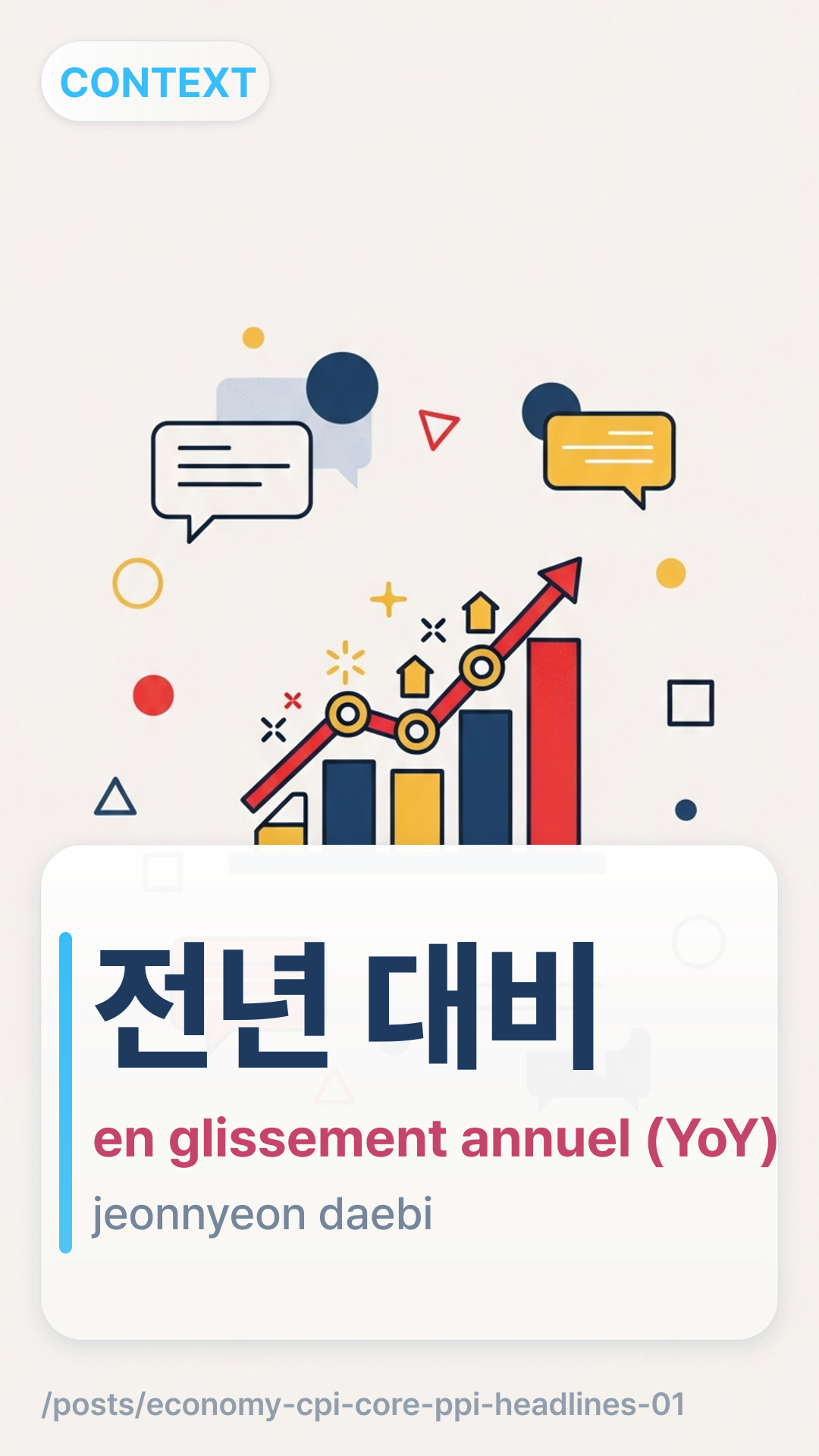 전년 대비 상승jeonnyeon daebi sangseung — en hausse vs le même mois l'an dernier전년 대비 하락jeonnyeon daebi harak — en baisse vs le même mois l'an dernier전년 대비 증가율/상승률jeonnyeon daebi jeunggayul/sangseungryul — croissance/rythme de hausse en glissement annuel (YoY)전년 대비 둔화/가속jeonnyeon daebi dunhwa/gasok — le rythme YoY ralentit/s'accélère전년 동월 대비jeonnyeon dowol daebi — même sens, plus « titre-friendly »