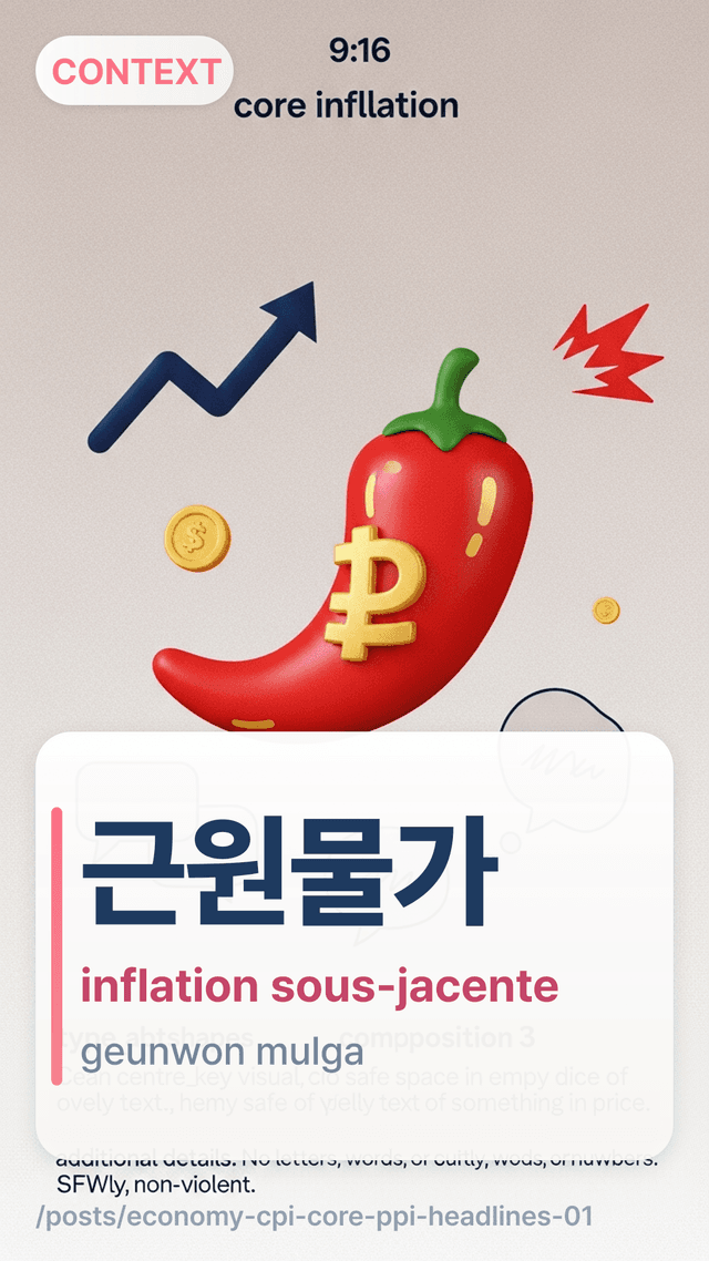 근원물가는 변동성이 큰 품목을 덜 반영한 지표로 자주 언급된다.geunwonmulganeun byeondongseoi keun pummogeul deol banyeonghan jipyoro jaju eongeupdoenda. — L'inflation sous-jacente est souvent citée comme un indicateur qui reflète moins les postes volatils.근원물가가 높게 나오면 ‘기조’에 대한 해석이 붙는 경우가 많다.geunwonmulgaga nopge naomyeon ‘gijo’e daehan haeseogi butneun gyeouga manda. — Quand le core sort haut, les titres ajoutent souvent une interprétation sur la « tendance sous-jacente ».근원물가가 낮다고 해서 체감물가가 낮다는 뜻은 아니다.geunwonmulgaga natdago haeseo chegammulgaga natdaneun tteuseun anida. — Un core faible ne veut pas dire que les gens ressentent des prix faibles.