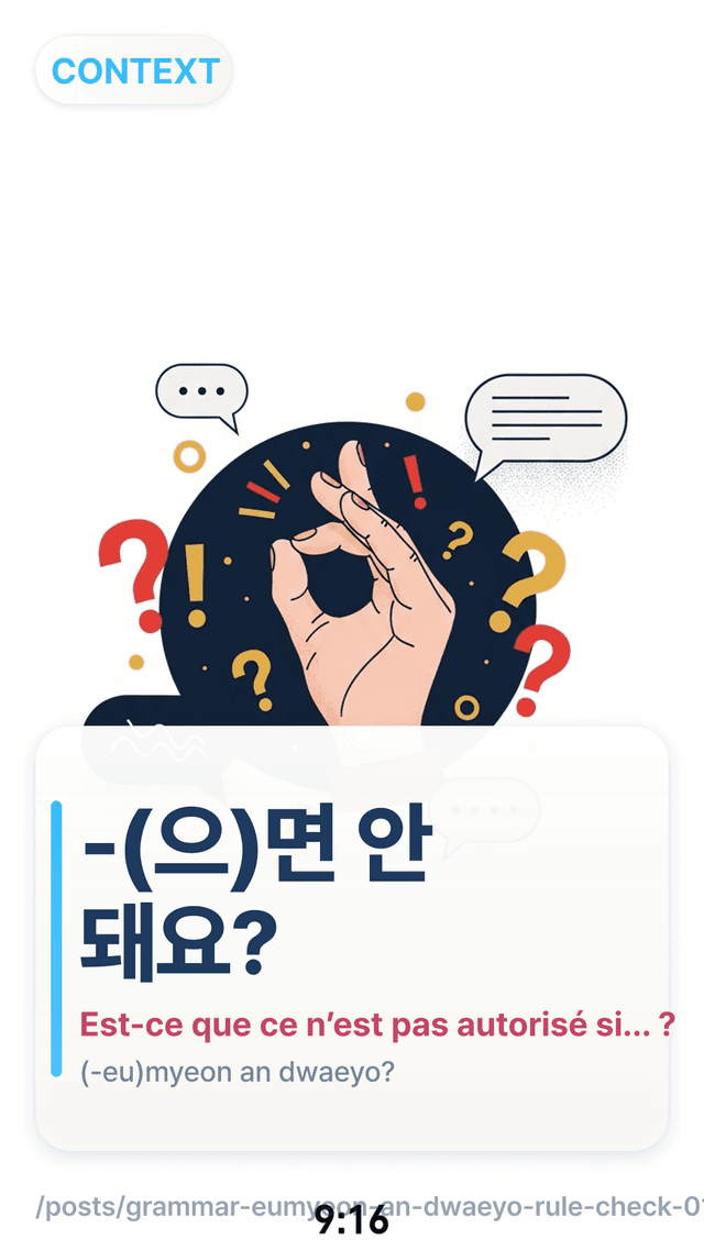Apprends à enseigner « -(으)면 안 돼요? » comme une vérification de règle (pas un reproche) grâce à un arbre d’intentions en 3 voies et 10 reformulations qui enlèvent le ton accusateur.
