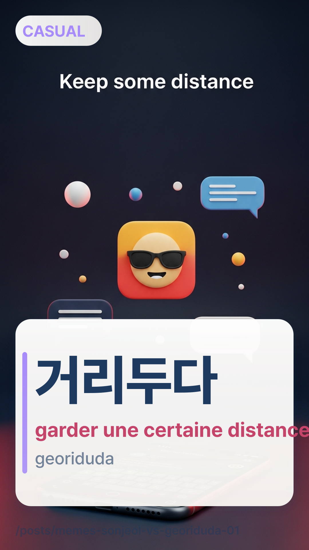 손절sonjeol, c’est couper quelqu’un (définitif), tandis que 거리두다georiduda, c’est créer de la distance (encore réversible).