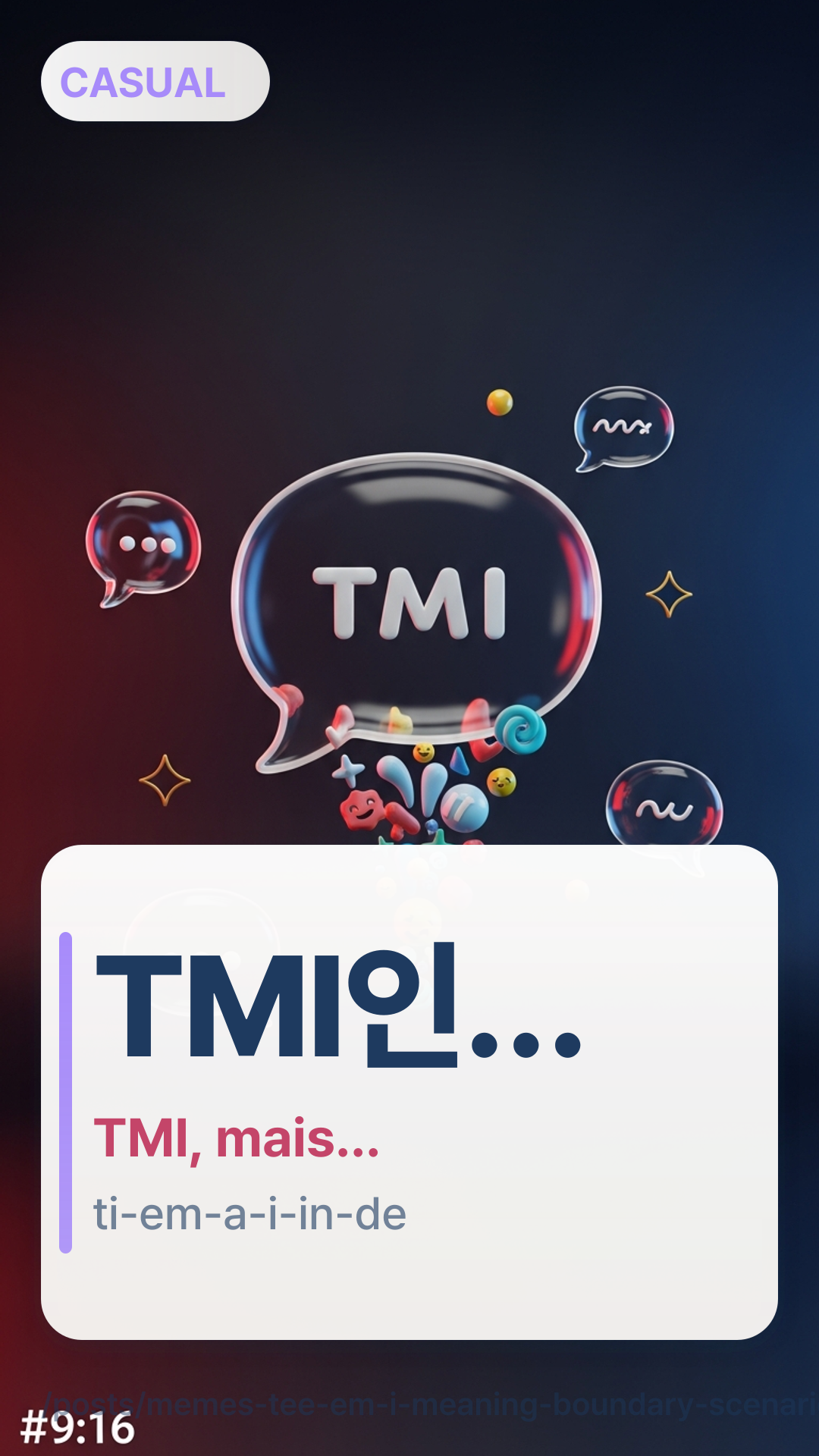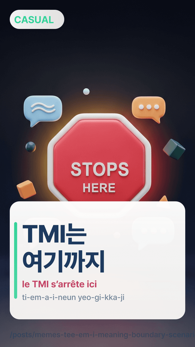 TMI est un mème de discussion coréen emprunté à l’anglais « Too Much Information ». En Corée, il s’emploie souvent à la légère, comme « des détails bonus amusants », mais il peut aussi vouloir dire « c’est trop personnel / inutile ». Piège fréquent : les apprenants pensent que ça sonne toujours impoli. Tout dépend du ton et de la relation.
