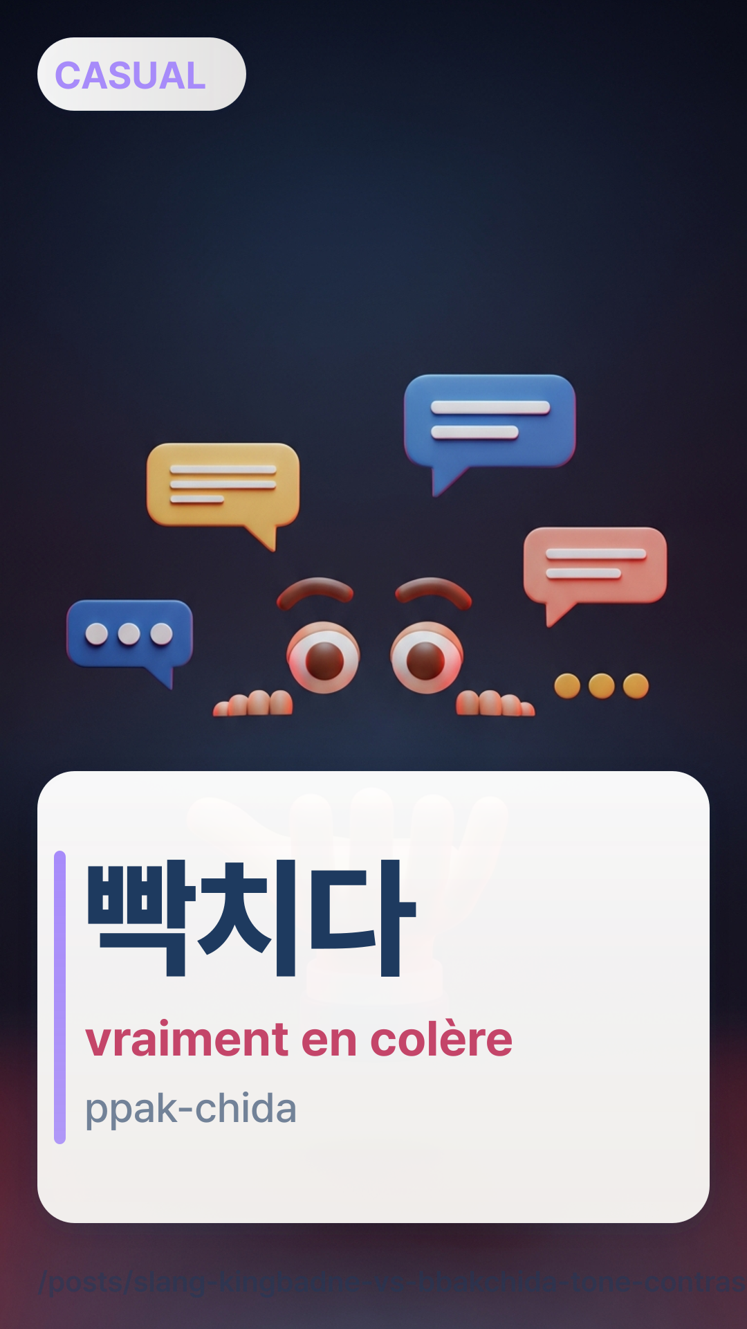 Comprendre 킹받네 vs 빡치다 avec un curseur d’irritation 0–5, un arbre de décision et des réécritures de messages : sonner naturel vite.