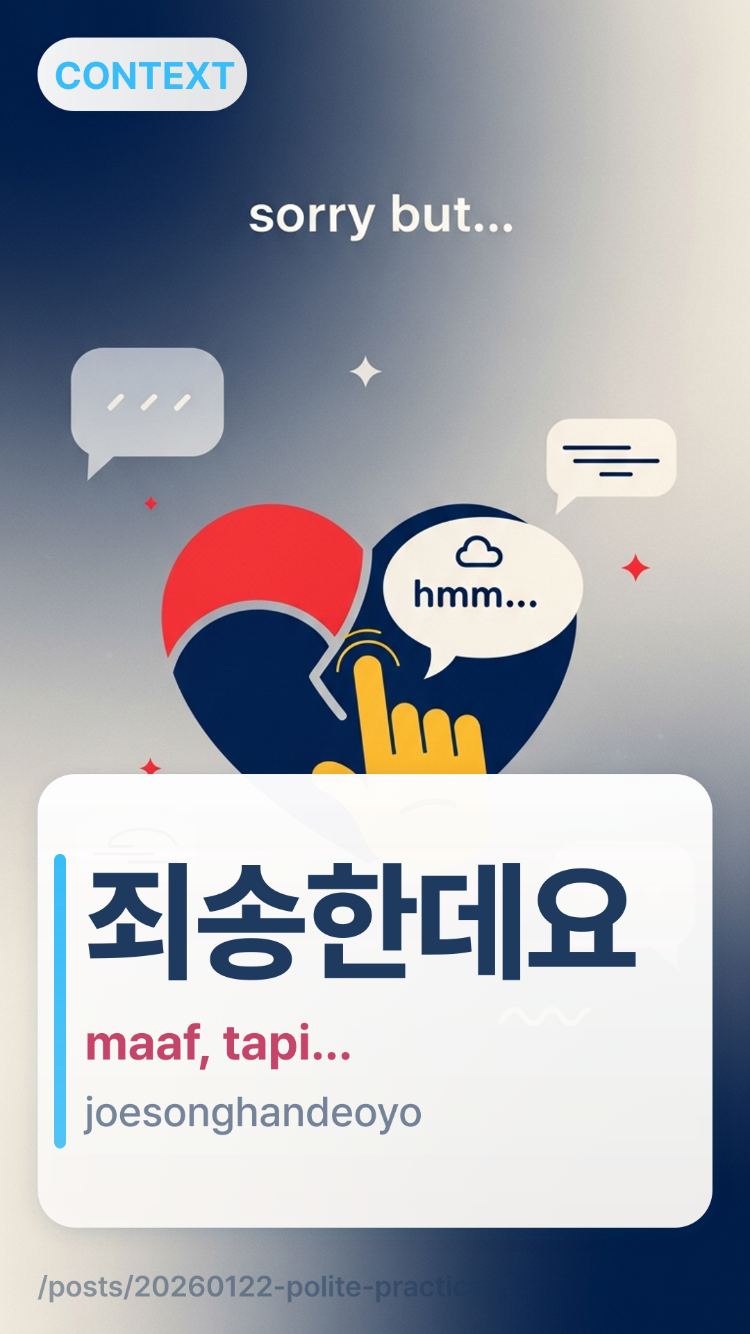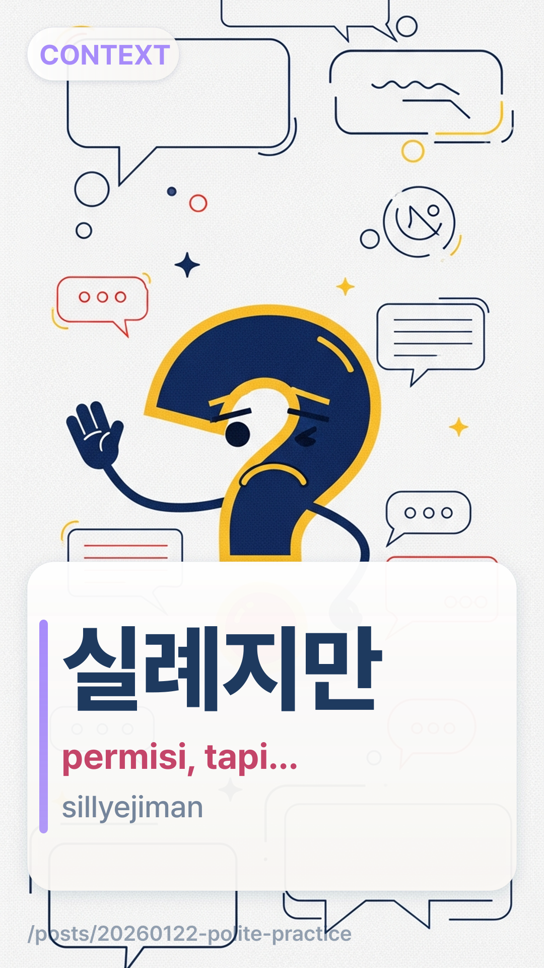 Minggu lalu di grup chat kerja KakaoTalk, aku melihat rekan junior minta perubahan cepat dengan 죄송한데요joesonghandeyo—dan suasananya tetap ramah, bukan tegang. Lima menit kemudian, seseorang mengirim DM screenshot dari kafe: seorang pelanggan memulai dengan 실례지만silryejiman sebelum meminta tukar kursi. Vibenya sama: sopan, tidak memaksa, dan sangat “naturally Korean” dalam pesan lisan/obrolan.